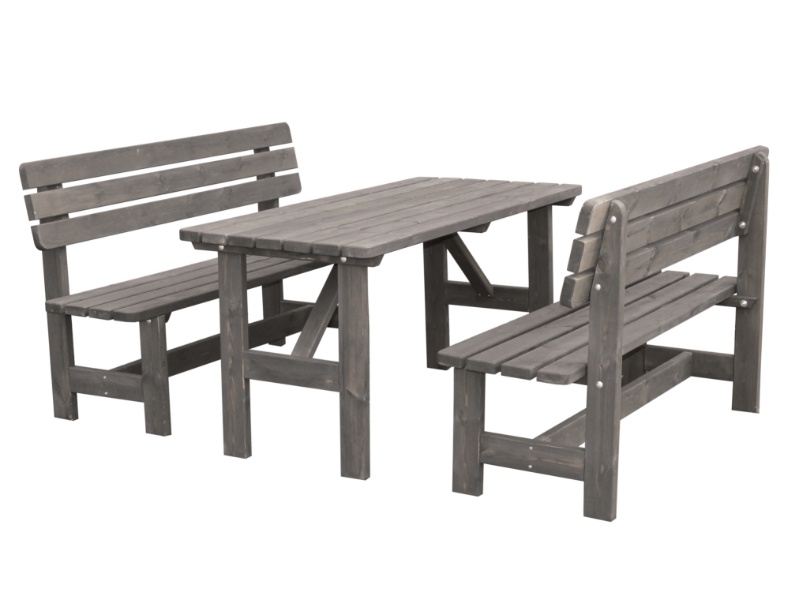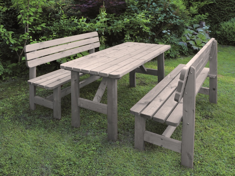 Dieses massive 3-teilige Gartenmöbel-Set besteht aus 2 Bänken mit Rückenlehnen und einem eckigen Tisch im rustikalen Design. Durch die stabile Bauart aus imprägniertem und somit wetterbeständigem FSC-zertifizierten Nadelholz werden Sie lange Freude an dieser grauen Sitzgarnitur haben. Die Bänke bieten jeweils Platz für bis zu 3 Personen und laden zu gemütlichen Stunden im eigenen Garten ein.