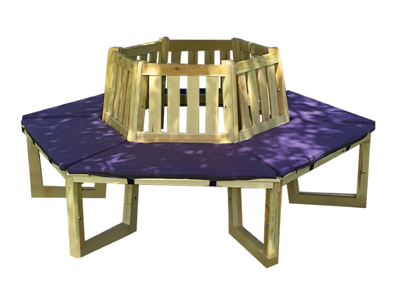 Eine Oase in Ihrem Garten - Stabile Bank aus massivem Kiefernholz, wetterfest imprägniert. Geeignet für Bäume bis 70 cm Durchmesser. Das Set enthält passende Sitzauflagen für die komplette Baumbank.