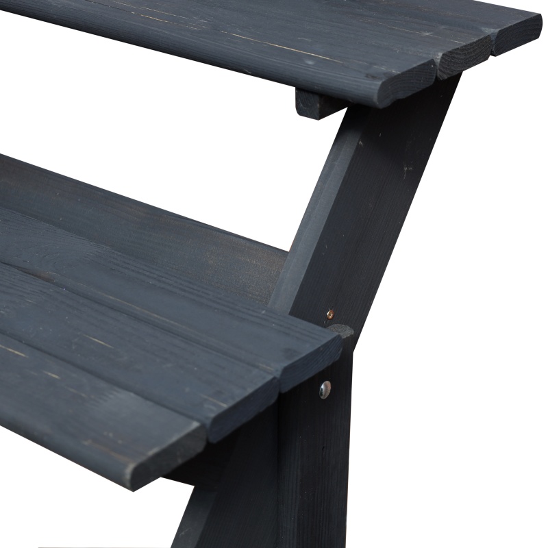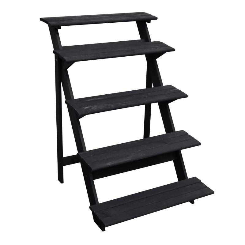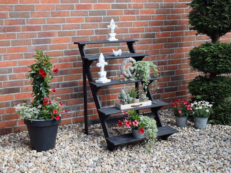 Fünf Stufen in den Blumenhimmel. Die Blumentreppe aus FSC-zertifiziertem Kiefernholz ist in einem anthraziten Farbton wetterfest imprägniert. Leichte Montage.