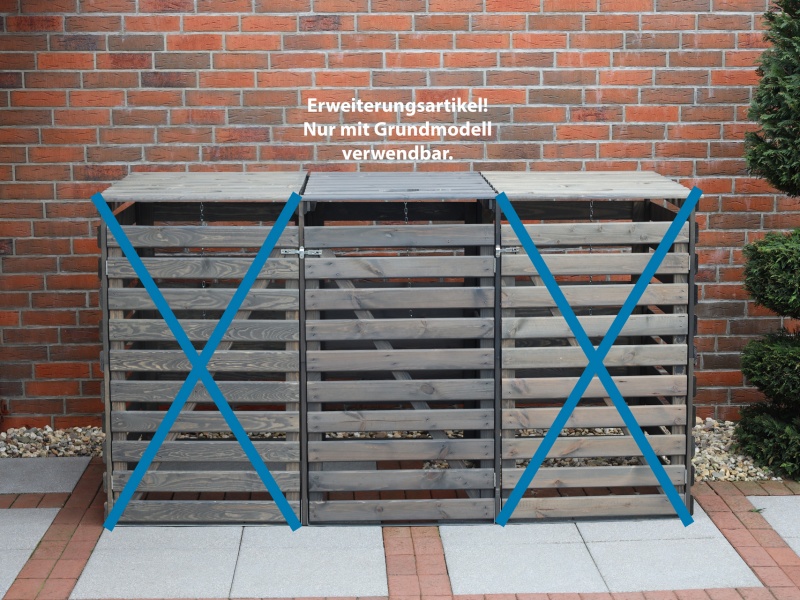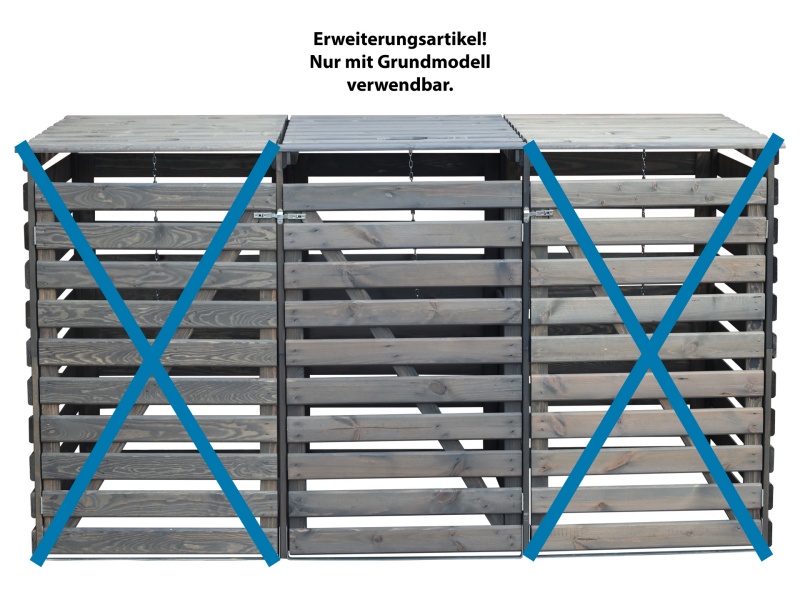 Diese formschönen, stabilen, aus massivem Kiefernholz gefertigten Boxen lassen unansehnliche Mülltonnen einfach verschwinden. Passend für alle Tonnen bis 240 Liter. Die praktische Klappe ist mit einer Kette ausgestattet, damit man mit einer Hand beim Öffnen der Müllbox gleichzeitig auch die Mülltonne öffnen kann. Die Stahlschiene am Boden verleiht der Box zusätzliche Stabilität. Die Rückwand ist verkleidet, so dass die Box auch frei aufgestellt werden kann. Mittels dieses Zubehörartikels können die Mülltonnendoppelboxen beliebig erweitert werden. Die Box ist bereits werkseitig grau imprägniert.