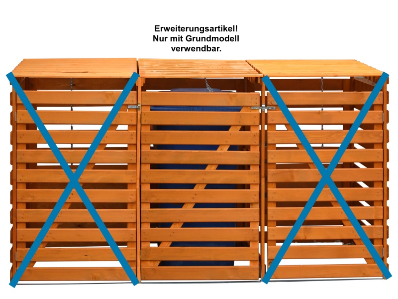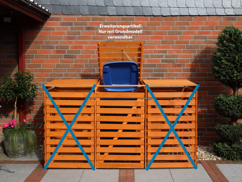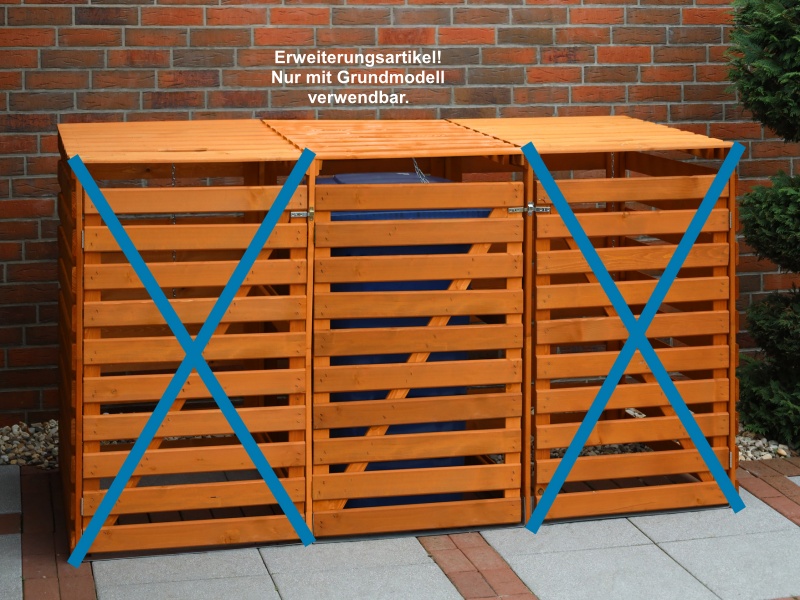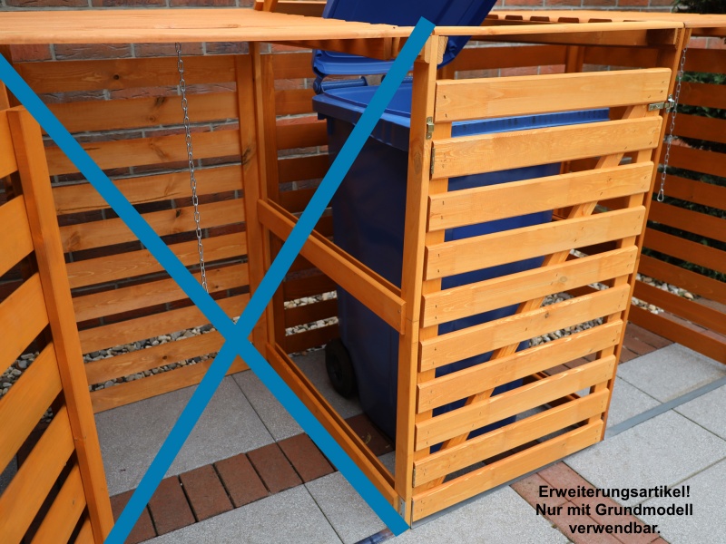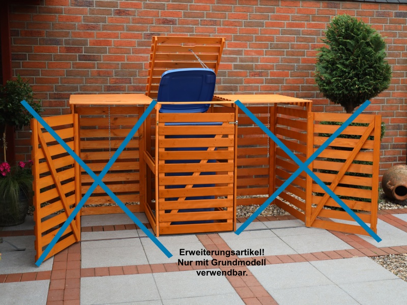 Diese formschönen, stabilen, aus massivem Kiefernholz gefertigten Boxen lassen unansehnliche Mülltonnen einfach verschwinden. Passend für alle Tonnen bis 240 Liter. Die praktische Klappe ist mit einer Kette ausgestattet, damit man mit einer Hand beim Öffnen der Müllbox gleichzeitig auch die Mülltonne öffnen kann. Die Stahlschiene am Boden verleiht der Box zusätzliche Stabilität. Die Rückwand ist verkleidet, so dass die Box auch frei aufgestellt werden kann. Mittels dieses Zubehörartikels können die Mülltonnenboxen beliebig erweitert werden.