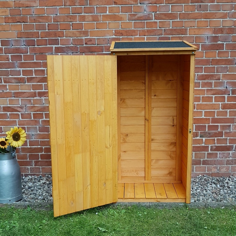 Der Geräteschrank mit der geringen Tiefe passt in jede Ecke Ihres Gartens. Die ideale Ergänzung für Ihr Kaminholzregal "Speyer". Der Anbauschrank lässt sich problemlos an Ihr bestehendes Kaminholzregal anbinden.