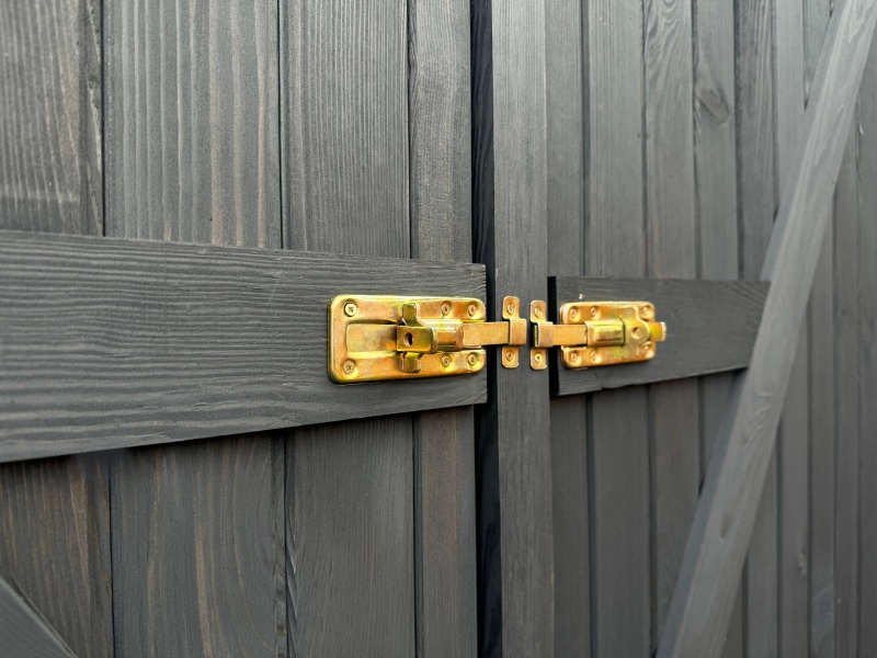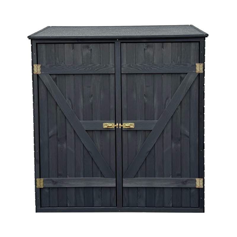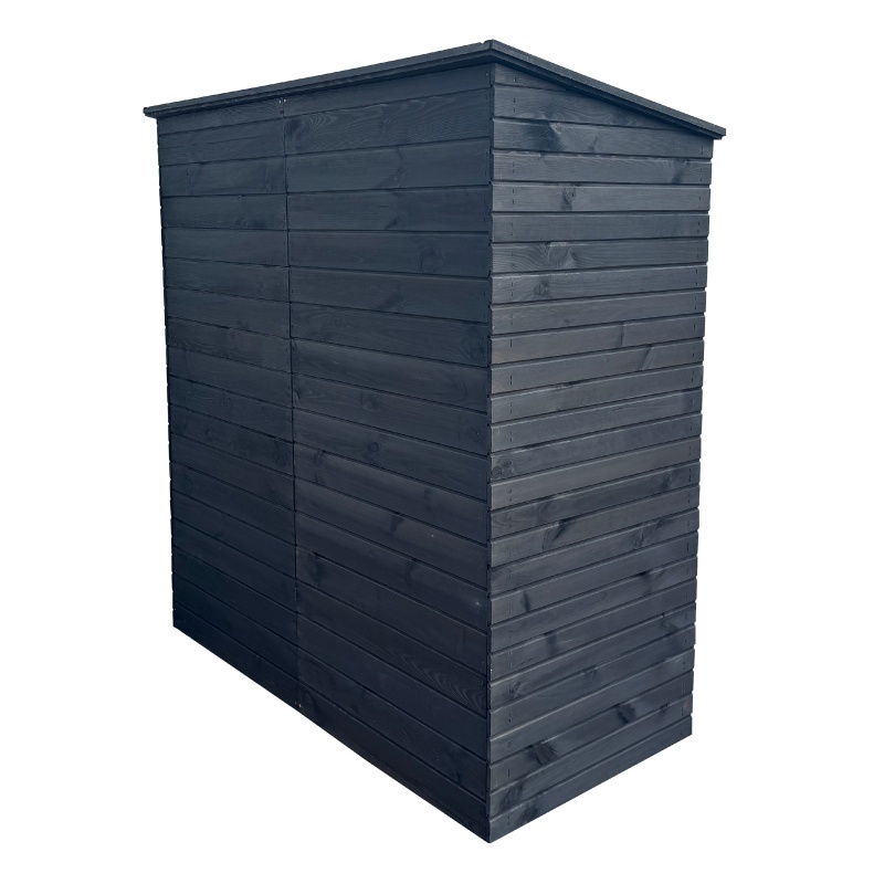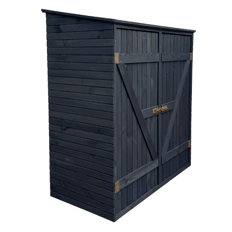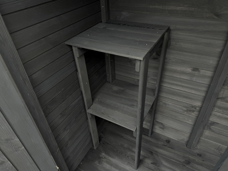 Die große Ausführung des Gartenschranks bietet sogar Platz für einen Rasenmäher. Mit integriertem Regal im Innenraum. Gefertigt aus massivem Kiefernholz – wetterfest imprägniert. Die Materialstärke beträgt 1,0 cm.
