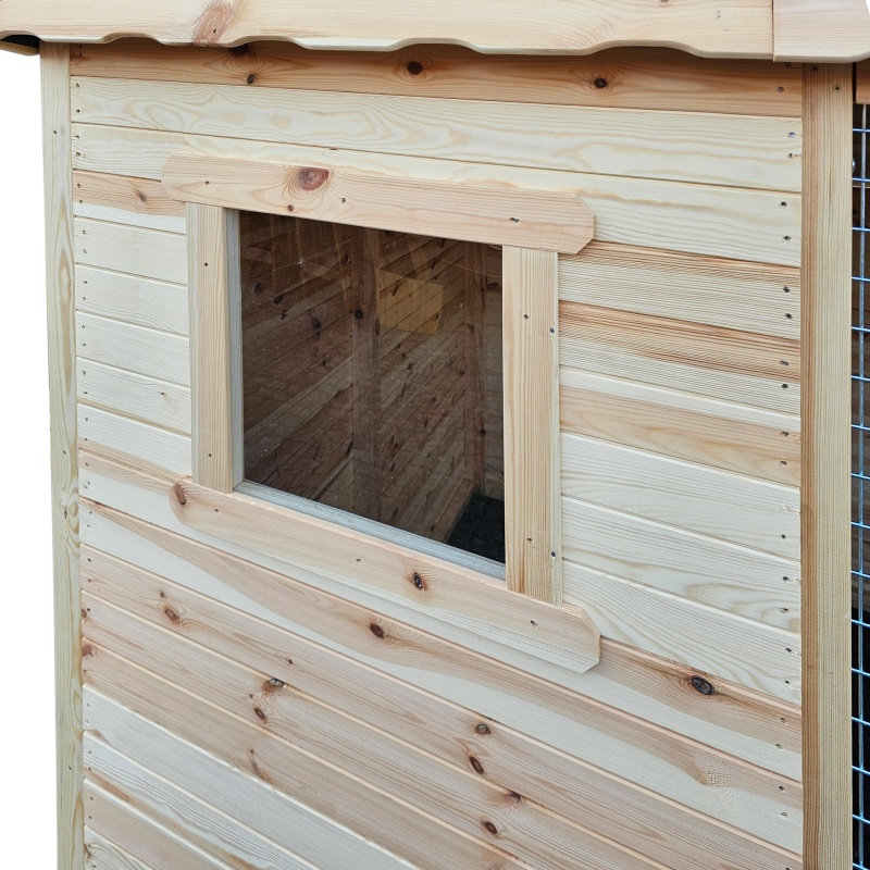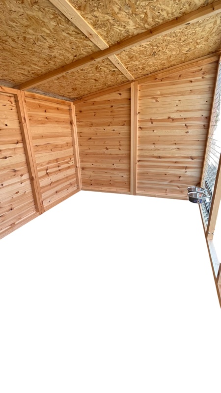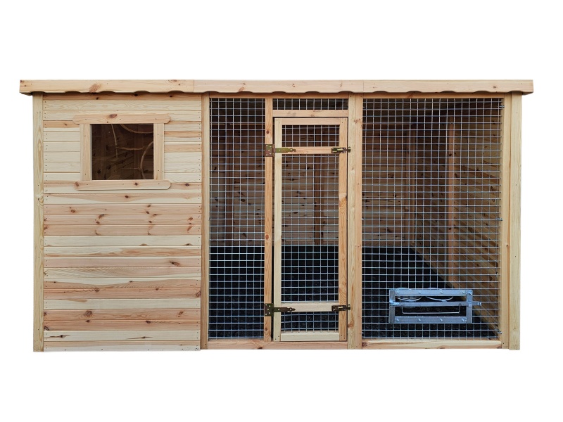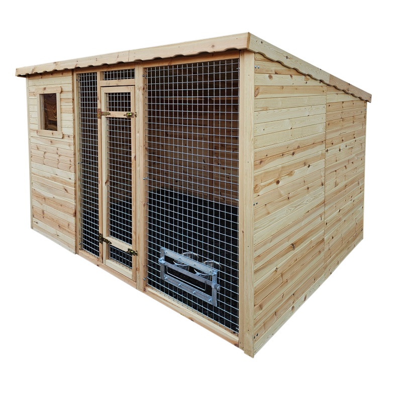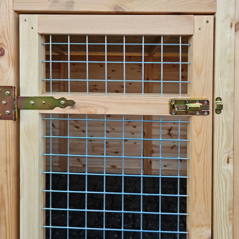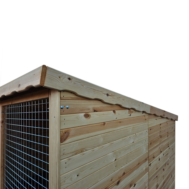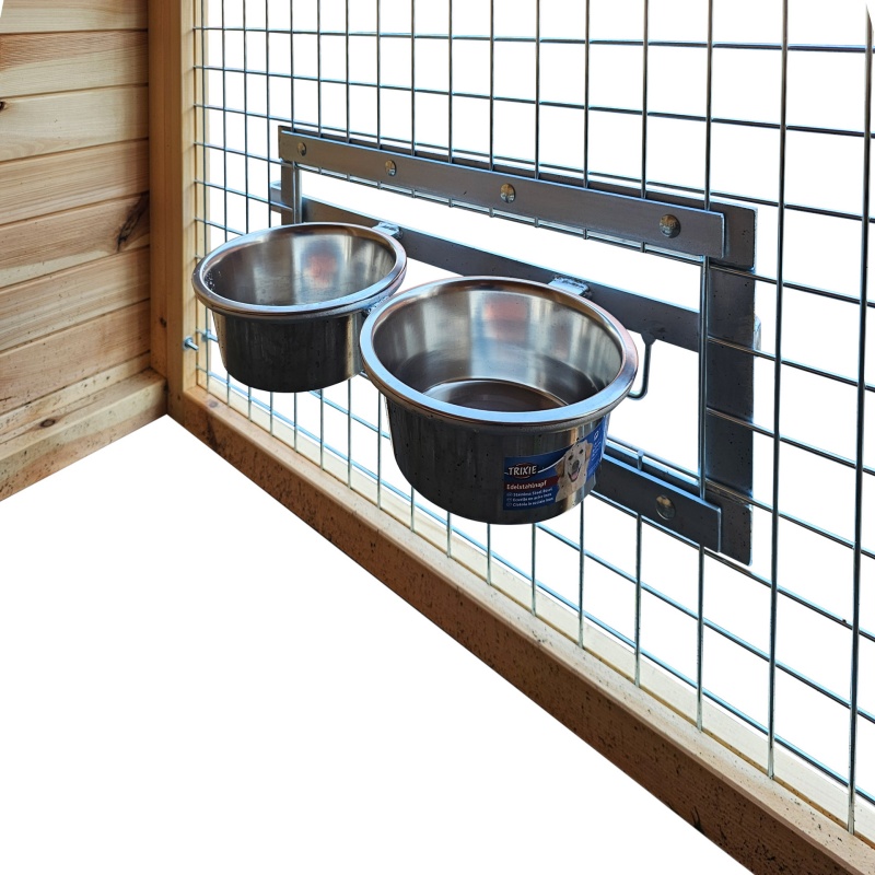 Geräumiger Zwinger aus massivem Kiefernholz ohne Holzfußboden mit verzinktem Drahtgitter. Drei Seiten und ein Frontelement sind geschlossen, um vor Zugluft zu schützen. Ein praktischer Klapphalter mit zwei Futterschalen ist im Lieferumfang enthalten und ermöglicht die Fütterung, ohne den Zwinger betreten zu müssen. So können auch fremde Personen den Hund versorgen. Alle Holzteile sind naturbelassen. Eine Dacheindeckung aus Dachpappe gehört ebenfalls zum Lieferumfang.