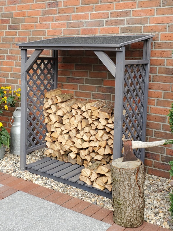 Stabiles Kaminholzregal aus massivem Kiefernholz, wetterfest imprägniert. Das Dach ist mit Dachpappe gedeckt. Das Kaminholzregal "Speyer" lässt sich seitlich mittels eines separat bestellbaren Erweiterungselementes beliebig vergrößern. Als weiteres Zubehör ist ein Regenschutz für die Front aus grünem PE-Gewebe separat zu erwerben.
