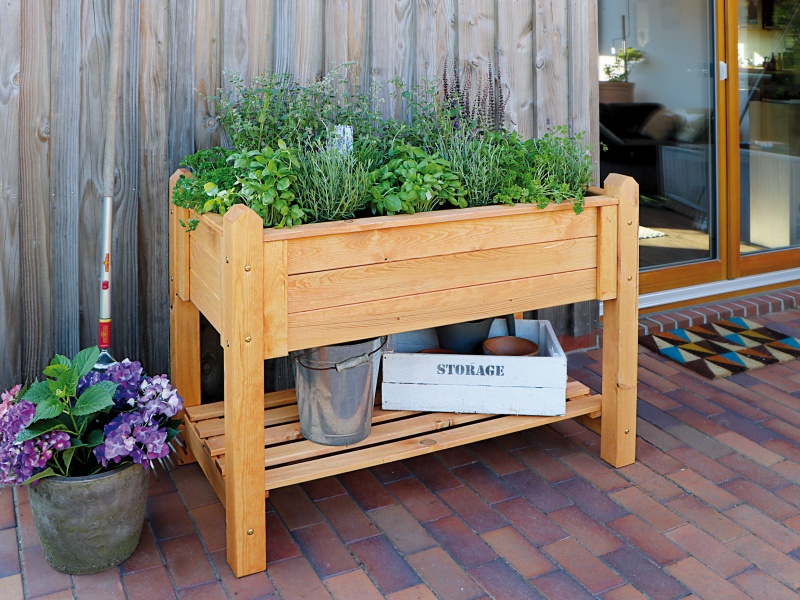 Als großer Vertreter dieser massiven Kräuterbeet-Serie bietet dieses im Farbton honigbraun gehaltene Hochbeet genügend Platz, um Küchenkräuter und Pflanzen jeder Art zu züchten. Dank der 7 cm starken Beine macht dieses aus imprägniertem Kiefernholz gefertigte Kräuterbeet einen sehr stabilen Eindruck. Im Lieferumfang enthalten ist eine passende Pflanzfolie.