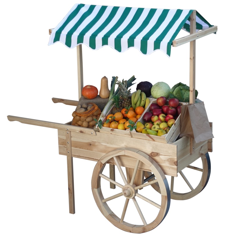 Ein idealer Blickfang: Zum Einsatz kommt er als Deko- oder Displayartikel. Aber auch als Beistell- oder Grillwagen auf der Gartenterrasse macht er eine gute Figur. Der originalgetreue Nachbau eines Marktwagens wird aus naturbelassenem Kiefernholz hergestellt. Die drehbaren Speichenräder sind mit einer verzinkten Metallbereifung ausgestattet. Ausführung mit Baldachin in weiß/grün.