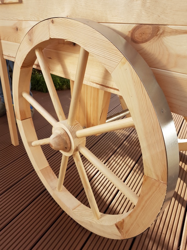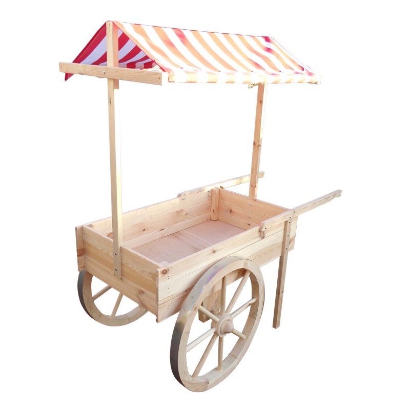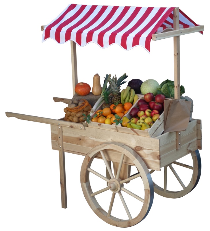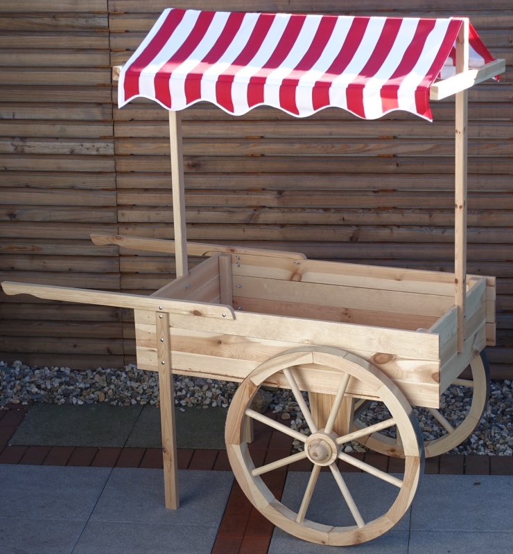 Ein idealer Blickfang: Zum Einsatz kommt er als Deko- oder Displayartikel. Aber auch als Beistell- oder Grillwagen auf der Gartenterrasse macht er eine gute Figur. Der originalgetreue Nachbau eines Marktwagens wird aus naturbelassenem Kiefernholz hergestellt. Die drehbaren Speichenräder sind mit einer verzinkten Metallbereifung ausgestattet. Ausführung mit Baldachin weiß/rot.