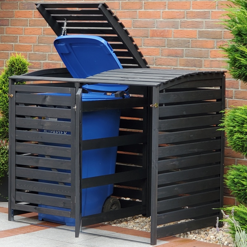 Diese formschönen, stabilen, aus massivem Kiefernholz gefertigten und umweltfreundlich imprägnierten Boxen lassen unansehnliche Mülltonnen einfach verschwinden. Passend für alle Tonnen bis 240 Liter. Die praktische Klappe ist mit einer Kette ausgestattet, damit man mit einer Hand beim Öffnen der Müllbox gleichzeitig auch die Mülltonne öffnen kann. Die Stahlschiene am Boden verleiht der Box zusätzliche Stabilität. Die Rückwand ist verkleidet, so dass die Box auch frei aufgestellt werden kann. Mittels einer separat zu erwerbenden Erweiterung ist diese 2er-Box beliebig für mehrere Tonnen erweiterbar.