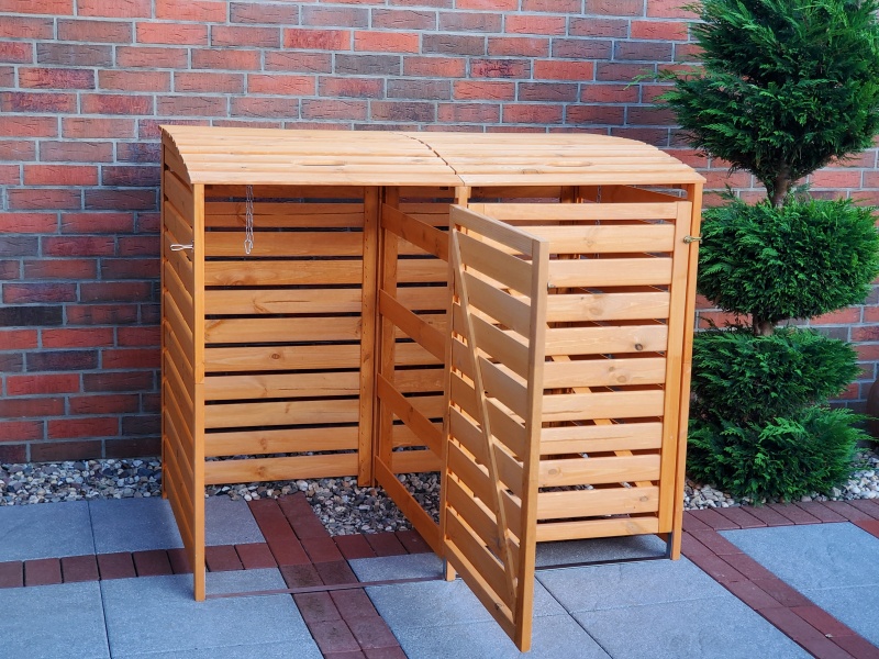 Diese formschönen, stabilen, aus massivem Kiefernholz gefertigten und umweltfreundlich imprägnierten Boxen lassen unansehnliche Mülltonnen einfach verschwinden. Passend für alle Tonnen bis 240 Liter. Die praktische Klappe ist mit einer Kette ausgestattet, damit man mit einer Hand beim Öffnen der Müllbox gleichzeitig auch die Mülltonne öffnen kann. Die Stahlschiene am Boden verleiht der Box zusätzliche Stabilität. Die Rückwand ist verkleidet, so dass die Box auch frei aufgestellt werden kann. Mittels einer separat zu erwerbenden Erweiterung ist diese 2er-Box beliebig für mehrere Tonnen erweiterbar.