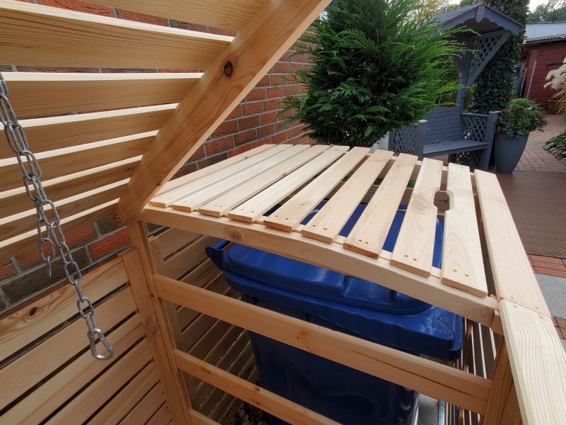 Diese formschönen, stabilen, aus massivem Kiefernholz gefertigten Boxen lassen unansehnliche Mülltonnen einfach verschwinden. Passend für alle Tonnen bis 240 Liter. Die praktische Klappe ist mit einer Kette ausgestattet, damit man mit einer Hand beim Öffnen der Müllbox gleichzeitig auch die Mülltonne öffnen kann. Die Stahlschiene am Boden verleiht der Box zusätzliche Stabilität. Die Rückwand ist verkleidet, so dass die Box auch frei aufgestellt werden kann. Mittels einer separat zu erwerbenden Erweiterung ist diese 2er-Box beliebig für mehrere Tonnen erweiterbar.