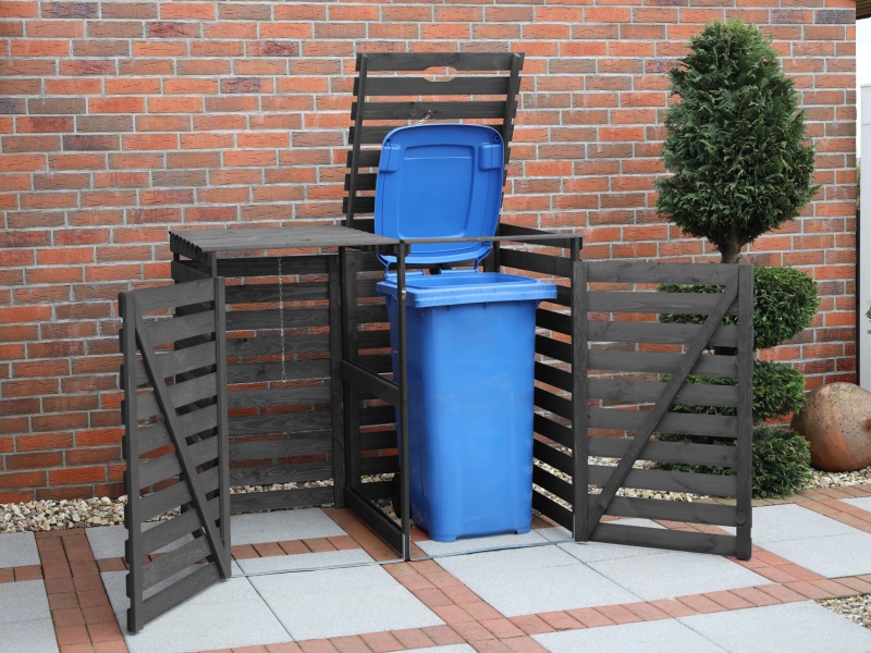 Diese formschöne, stabile, aus massivem Kiefernholz gefertigte Box lässt unansehnliche Mülltonnen einfach verschwinden. Passend für alle Tonnen bis 240 Liter. Die praktische Klappe ist mit einer Kette ausgestattet, damit man mit einer Hand beim Öffnen der Müllbox gleichzeitig auch die Mülltonne öffnen kann. Die Stahlschiene am Boden verleiht der Box zusätzliche Stabilität. Die Rückwand ist verkleidet, so dass die Box auch frei aufgestellt werden kann. Die Box ist anthrazit imprägniert.