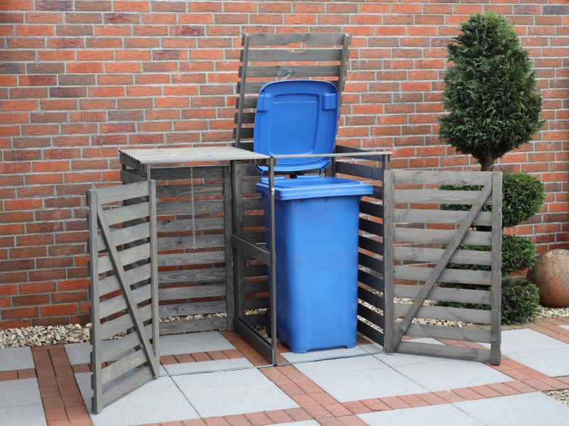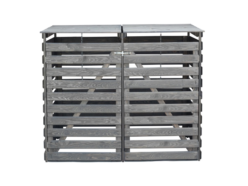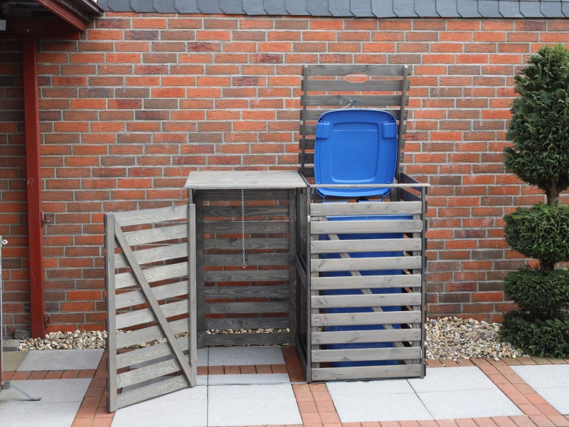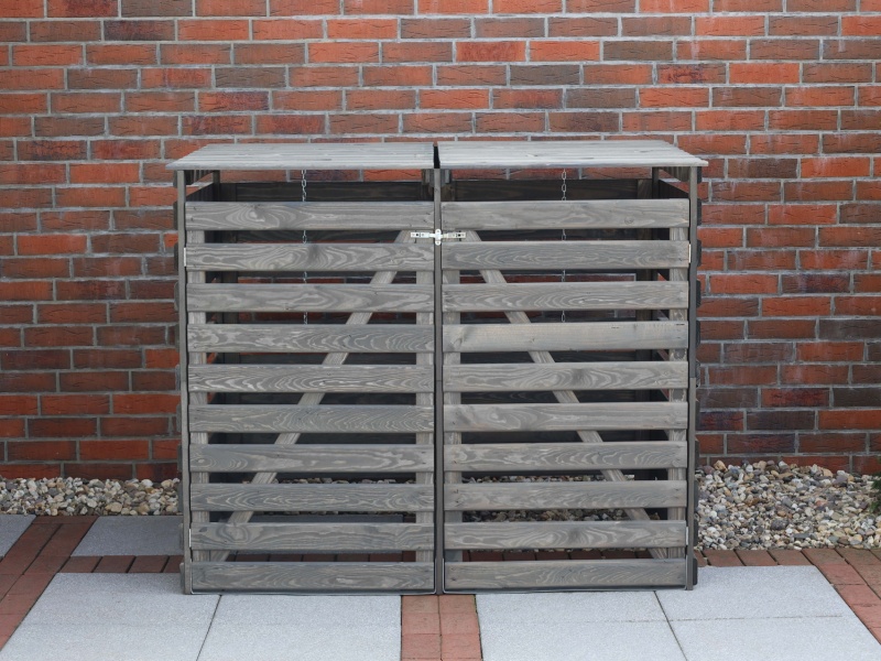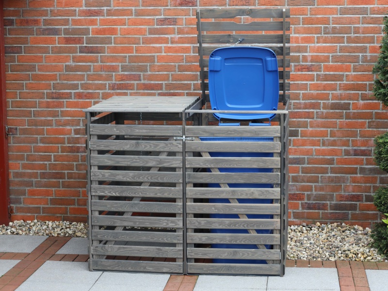 Diese formschönen, stabilen, aus massivem Kiefernholz gefertigten Boxen lassen unansehnliche Mülltonnen einfach verschwinden. Passend für alle Tonnen bis 240 Liter. Die praktische Klappe ist mit einer Kette ausgestattet, damit man mit einer Hand beim Öffnen der Müllbox gleichzeitig auch die Mülltonne öffnen kann. Die Stahlschiene am Boden verleiht der Box zusätzliche Stabilität. Die Rückwand ist verkleidet, so dass die Box auch frei aufgestellt werden kann. Mittels eines als Zubehör zu erwerbenden Erweiterungselementes kann diese 2er-Box beliebig erweitert werden. Die Box ist bereits werkseitig grau imprägniert.