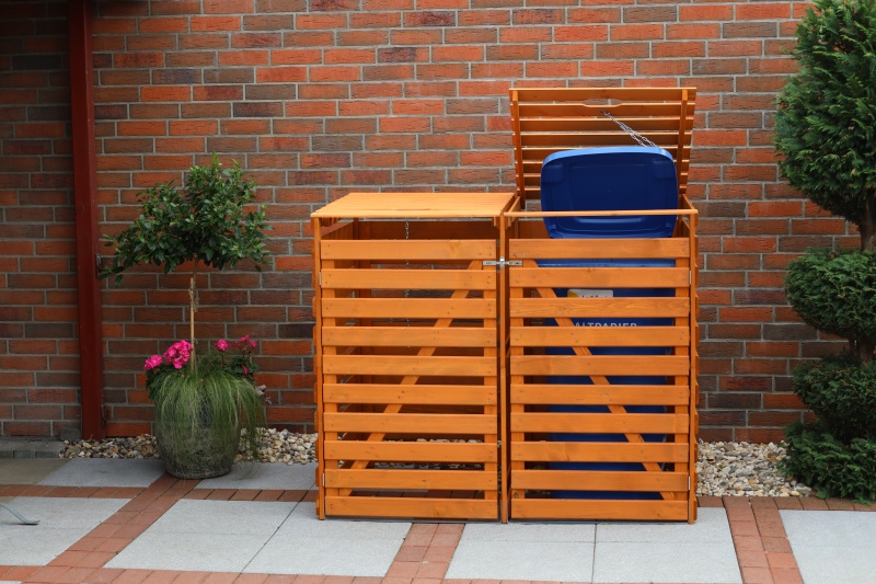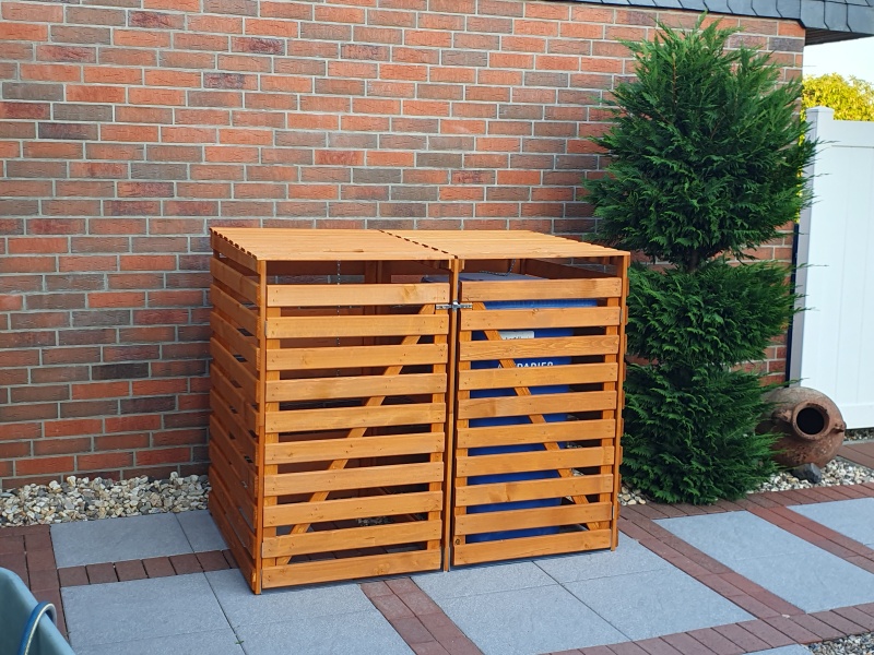 Diese formschöne, stabile, aus massivem Kiefernholz gefertigte Box lässt unansehnliche Mülltonnen einfach verschwinden. Passend für alle Tonnen bis 240 Liter. Die praktische Klappe ist mit einer Kette ausgestattet, damit man mit einer Hand beim Öffnen der Müllbox gleichzeitig auch die Mülltonne öffnen kann. Die Stahlschiene am Boden verleiht der Box zusätzliche Stabilität. Die Rückwand ist verkleidet, so dass die Box auch frei aufgestellt werden kann. Die Box ist honigbraun imprägniert.
