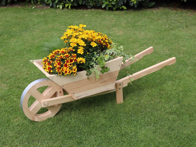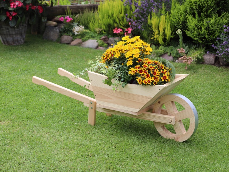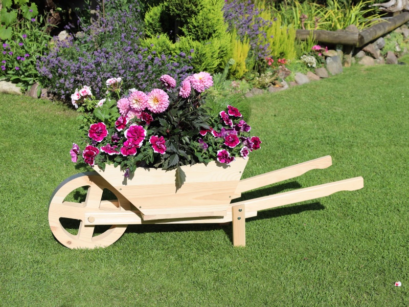 Diese dekorative Schubkarre ist aus naturbelassenem Kiefernholz gefertigt - bepflanzt eine Zierde für jeden Garten.