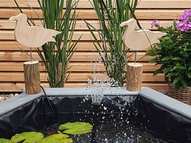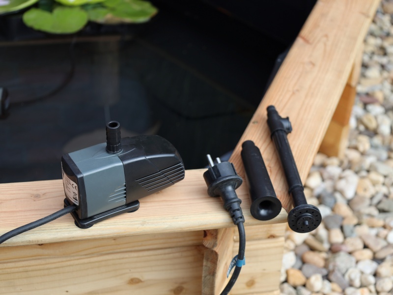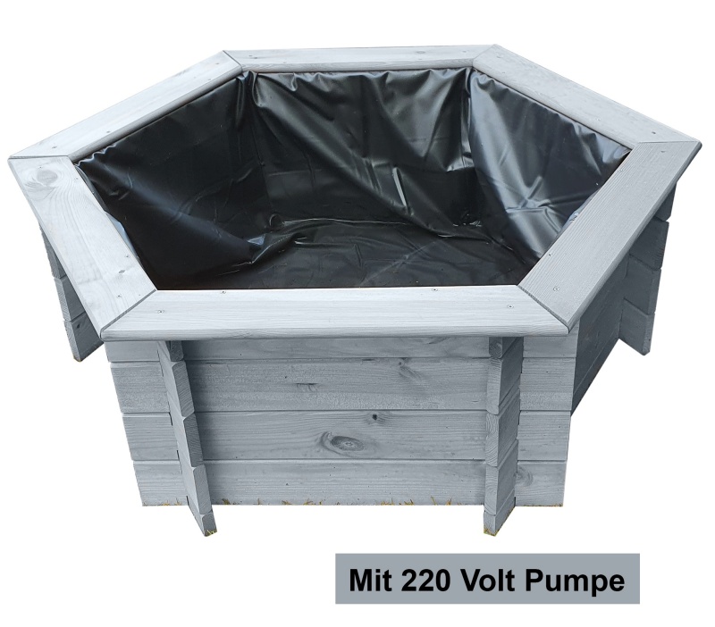 Dekorativer Hochteich aus massivem Kiefernholz, wetterfest imprägniert. Zum Lieferumfang gehören eine Teichfolie und eine hochwertige Teichpumpe (600 ltr/Std., 10 m Kabel) mit Springbrunnendüsen. Durchmesser 100 cm.
