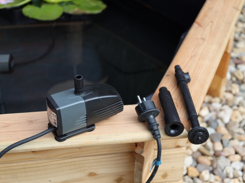 Dekorativer Hochteich aus massivem Kiefernholz, wetterfest imprägniert. Zum Lieferumfang gehört eine Teichfolie und eine hochwertige Teichpumpe (600 l/Std., 10 m Kabel) mit Springbrunnendüsen.