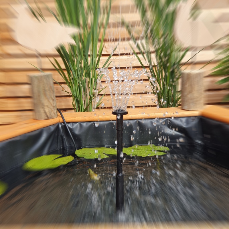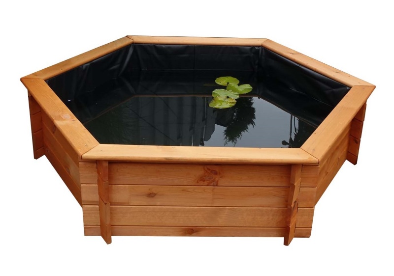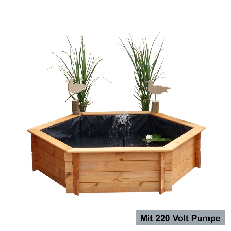 Dekorativer Hochteich aus massivem Kiefernholz, wetterfest imprägniert. Zum Lieferumfang gehört eine Teichfolie und eine hochwertige Teichpumpe (600 l/Std., 10 m Kabel) mit Springbrunnendüsen.