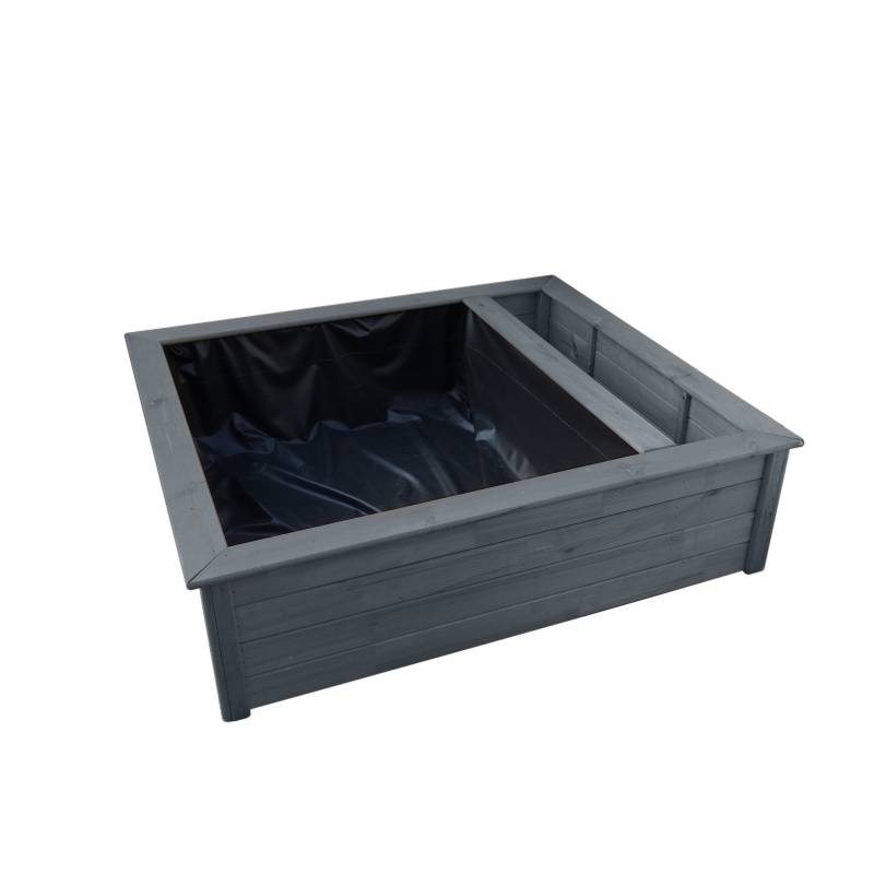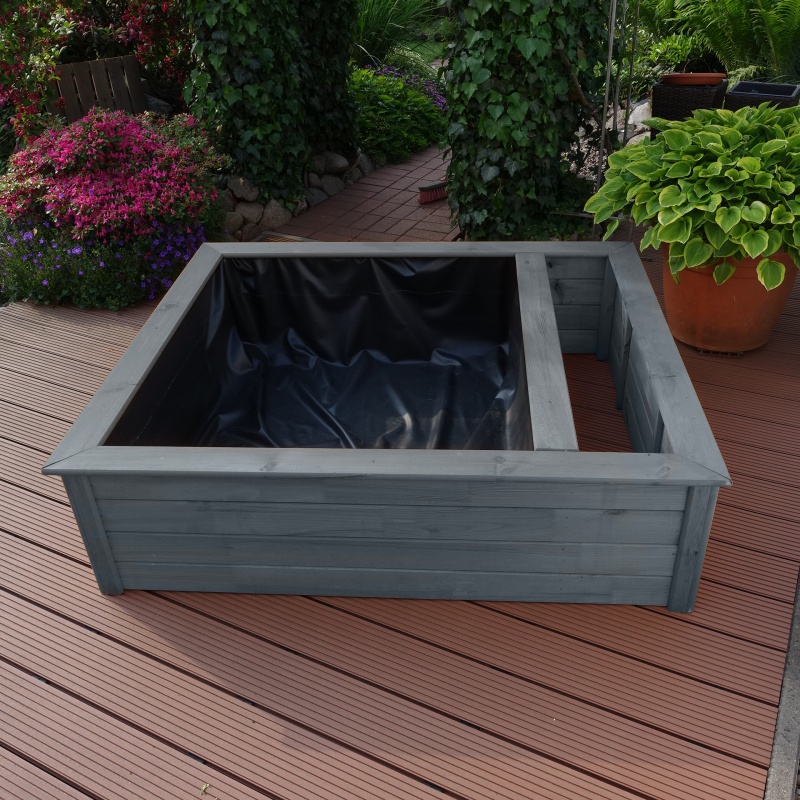 Dekorativer Hochteich aus massivem Kiefernholz, wetterfest imprägniert. Zum Lieferumfang gehören eine Teichfolie und eine hochwertige Teichpumpe (600 ltr/Std., 10 m Kabel) mit Springbrunnendüsen.