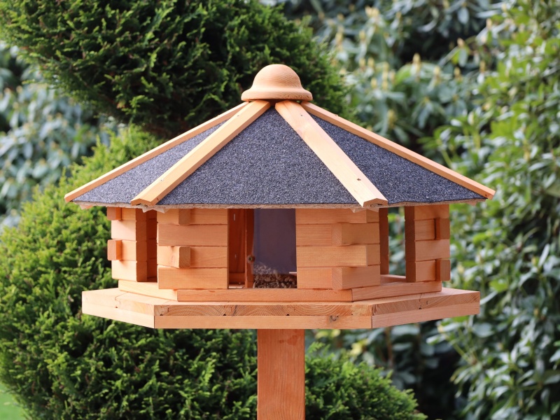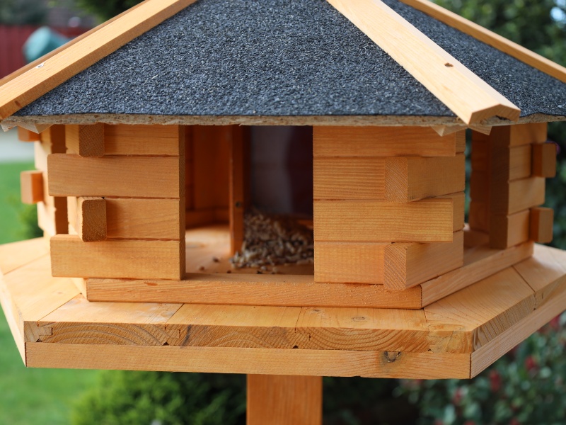 In aufwendiger Handarbeit aus massivem Kiefernholz gefertigt - wetterfest imprägniert. Das Dach besteht aus Holz und wird durch Dachpappe geschützt. Damit hält das Dach jedem Wetter stand. Mit integriertem Futtersilo, das von oben befüllbar ist.