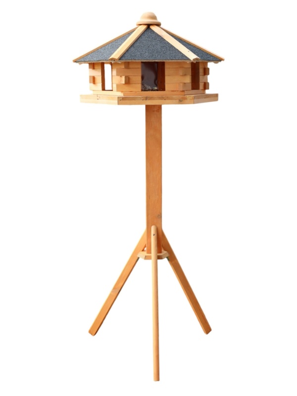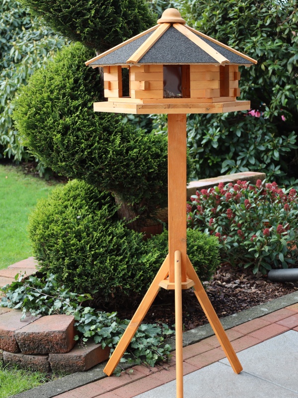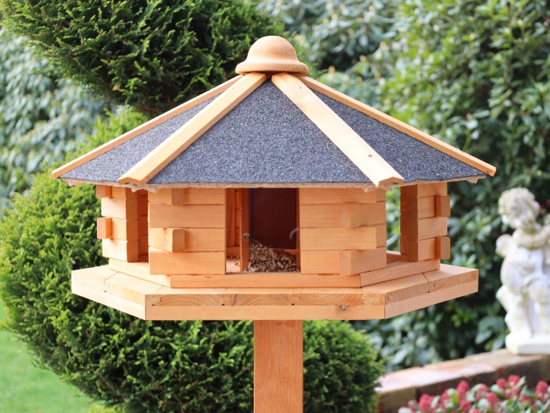 In aufwendiger Handarbeit aus massivem Kiefernholz gefertigt - wetterfest imprägniert. Das Dach dieses Vogelhauses besteht aus Holz und wird durch Dachpappe geschützt. Damit hält das Dach jedem Wetter stand. Mit integriertem Futtersilo, das von oben befüllbar ist. Mitgeliefert wird in diesem Set ein Standfuß.