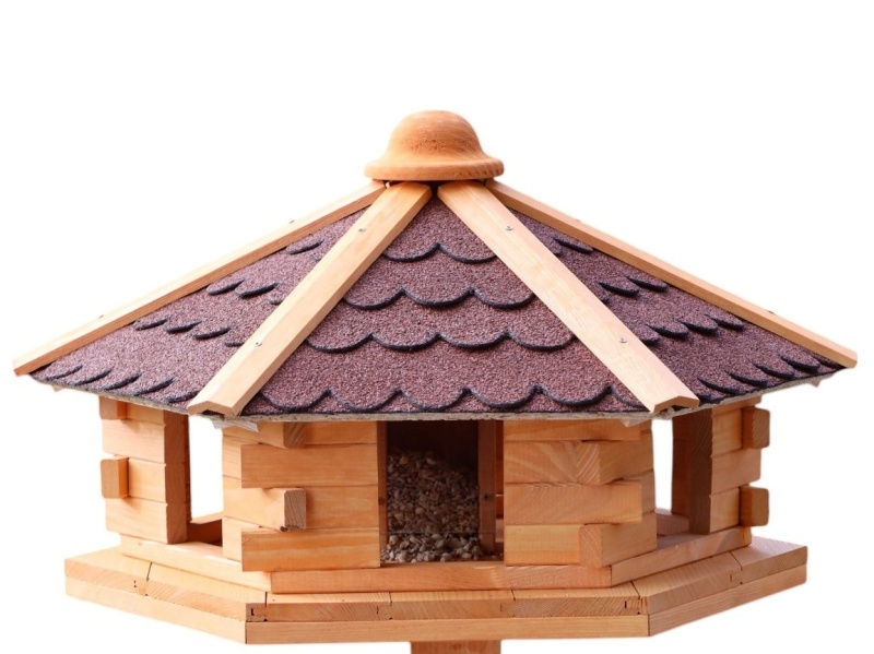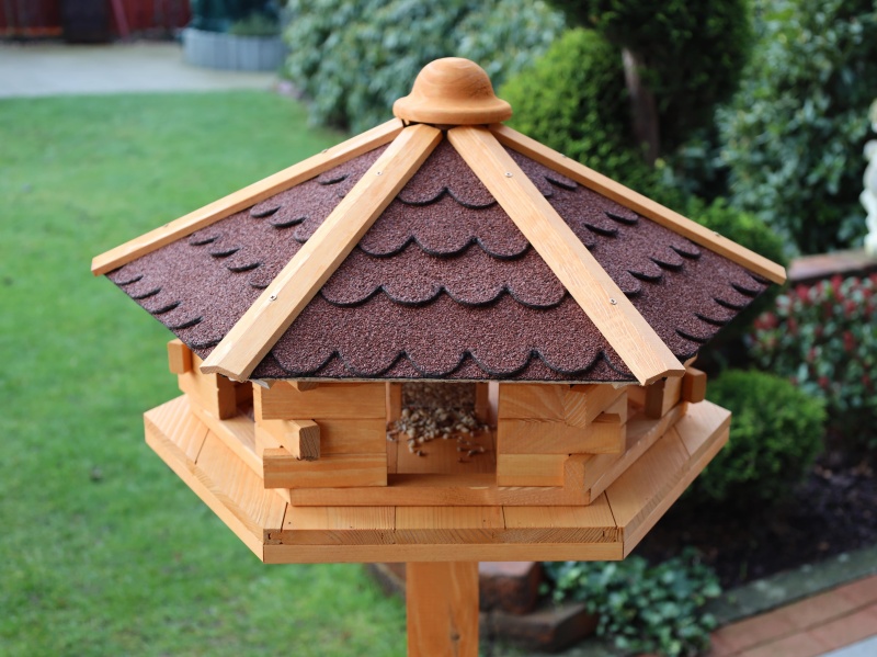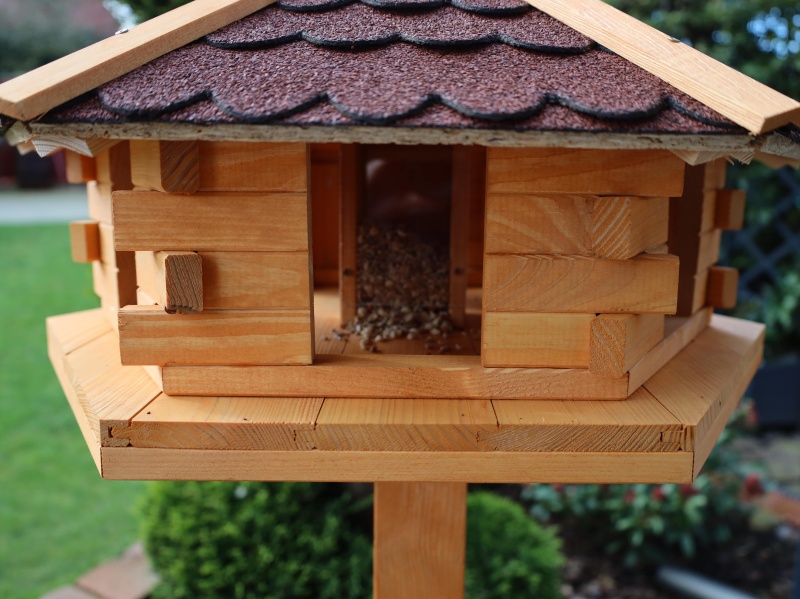 In aufwendiger Handarbeit aus massivem Kiefernholz gefertigt - wetterfest imprägniert. Das Dach wird durch Bitumendachbahnen geschützt und hält jedem Wetter stand. Mit integriertem Futtersilo (von oben befüllbar).