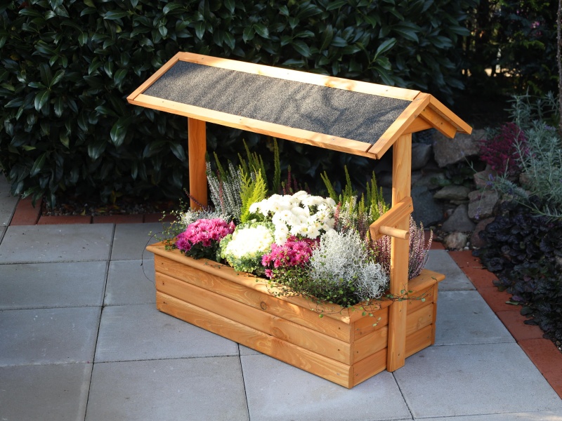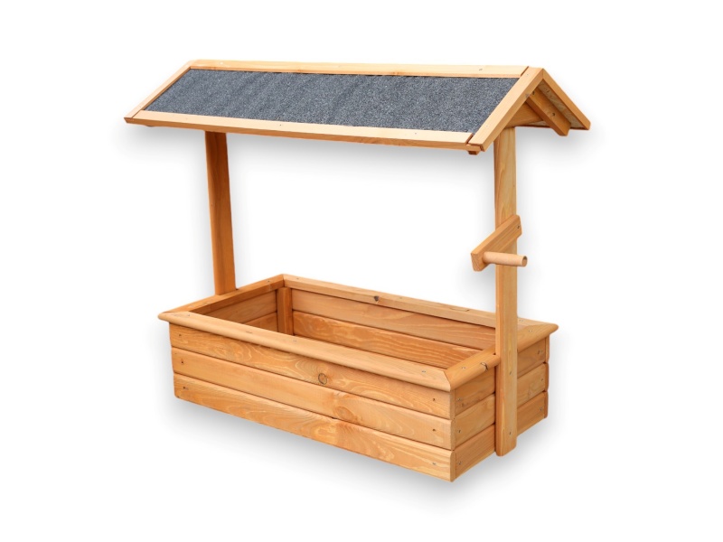 Dekorativer Zierbrunnen aus imprägniertem Kiefernholz mit Holzdach und Dachpappe.