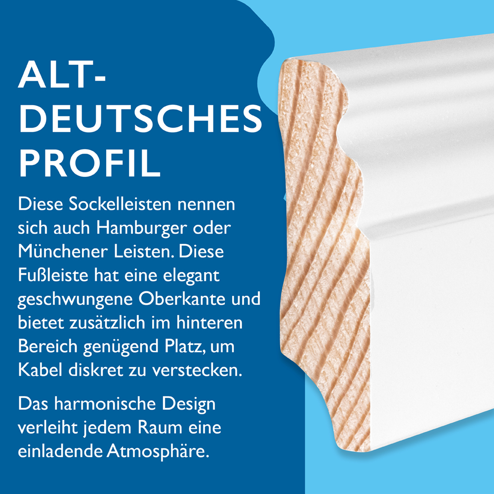 Unsere Sockelleiste Kiefer in den Abmessungen 16 x 58 x 2400 mm vereint Eleganz und Funktionalität. Das altdeutsche Profil bietet eine elegante und traditionelle Optik, die Ihrem Zuhause eine besondere Note verleiht.