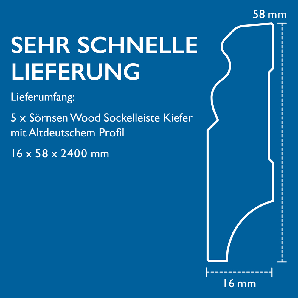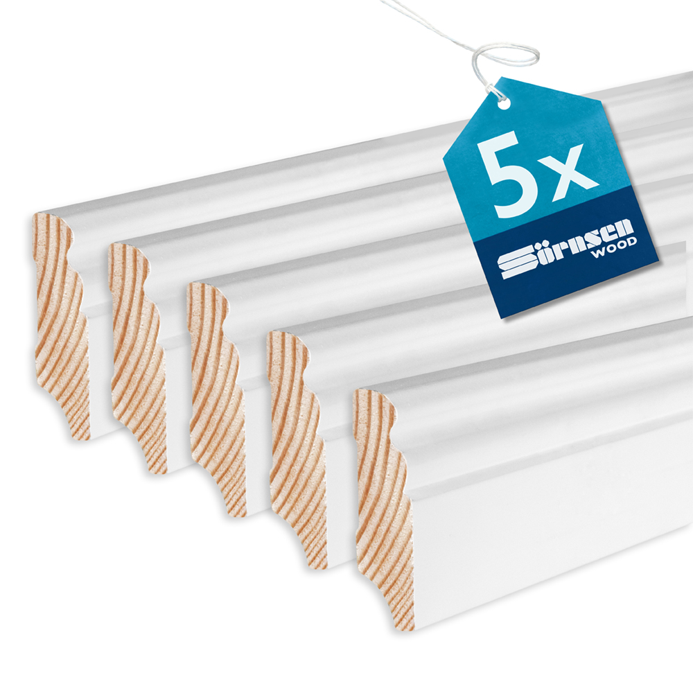 Produktinformationen "5x Sockelleiste Kiefer mit Altdeutschem Profil, weiß, 16 x 58 x 2400 mm, Sörnsen Wood"
