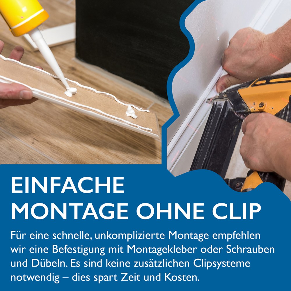Die Montage ist unkompliziert und schnell: Mit Montagekleber oder Schrauben und Dübeln befestigt, benötigen Sie keine zusätzlichen Clipsysteme. Dies spart Ihnen Zeit und Kosten. Unsere Sockelleisten sind in praktischen Bündeln zu je 5 Stück erhältlich, ideal für größere Projekte.