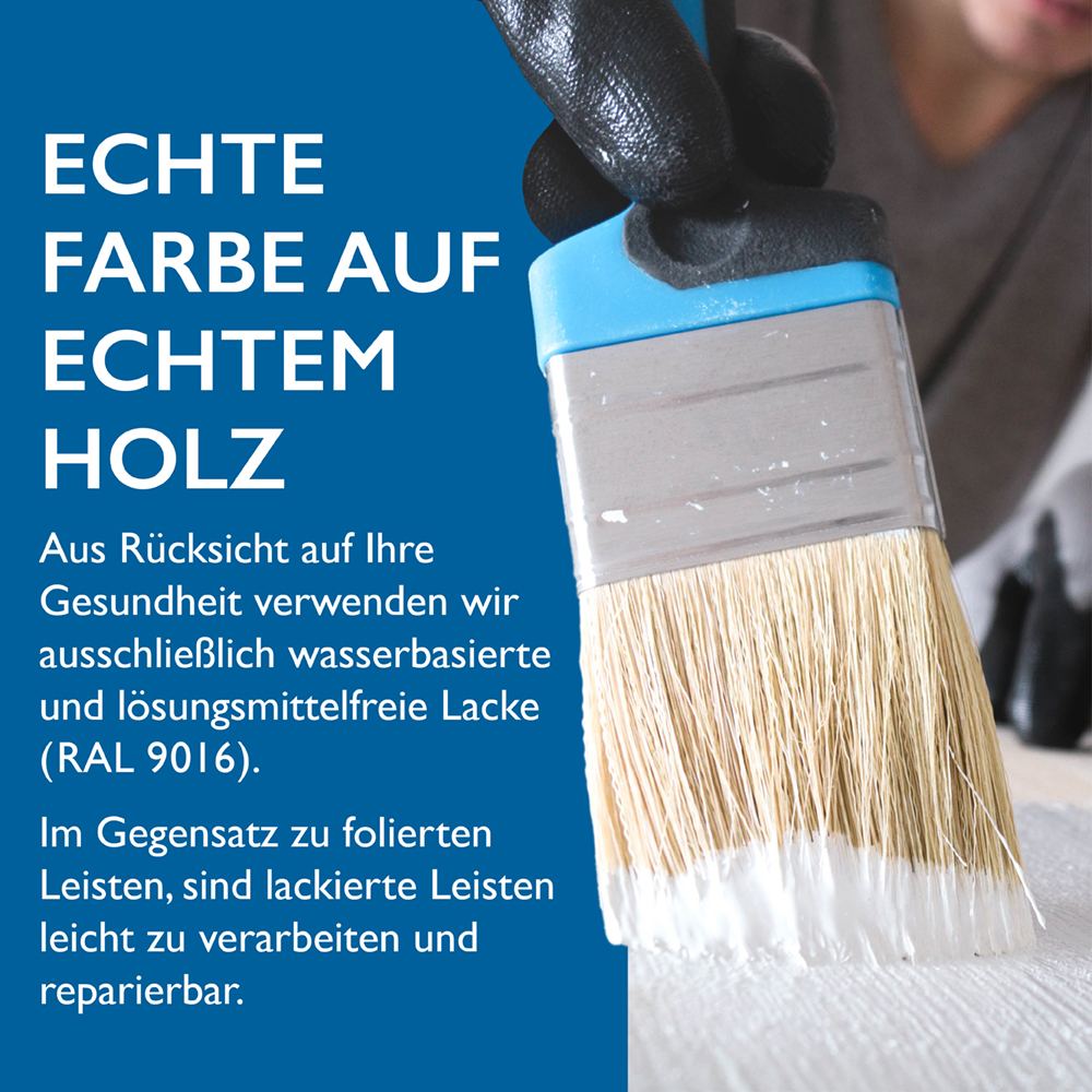 Gefertigt aus nordischer Kiefer, überzeugt diese Massivholzleiste durch ihre Stabilität und Langlebigkeit. Die Leiste ist PEFC oder FSC zertifiziert und somit umweltfreundlich und nachhaltig produziert. Die dreifache, lösemittelfreie Lackierung (Farbton: RAL 9016) der Bodenleisten mit gesundheitsschonendem und umweltfreundlichem Wasserlack sorgt für eine gleichmäßige, glatte Oberfläche, die leicht zu reinigen ist und Ihrem Raum ein modernes, sauberes Finish verleiht. Ein weiterer Vorteil: Im Gegensatz zu folierten Leisten, sind lackierte Leisten leicht zu verarbeiten und reparierbar.