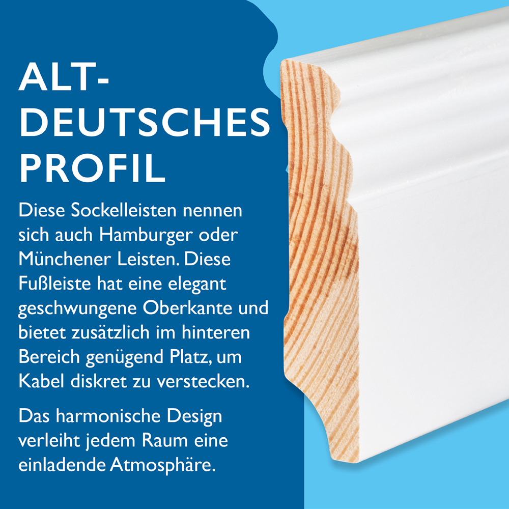 Unsere Sockelleiste Kiefer in den Abmessungen 16 x 70 x 2400 mm vereint Eleganz und Funktionalität. Das altdeutsche Profil bietet eine elegante und traditionelle Optik, die Ihrem Zuhause eine besondere Note verleiht.