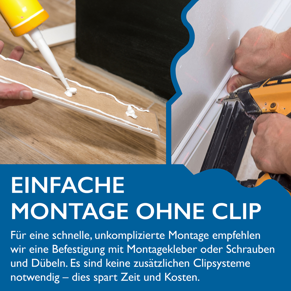 Die Montage ist unkompliziert und schnell: Mit Montagekleber oder Schrauben und Dübeln befestigt, benötigen Sie keine zusätzlichen Clipsysteme. Dies spart Ihnen Zeit und Kosten. Unsere Sockelleisten sind in praktischen Bündeln zu je 5 Stück erhältlich, ideal für größere Projekte.