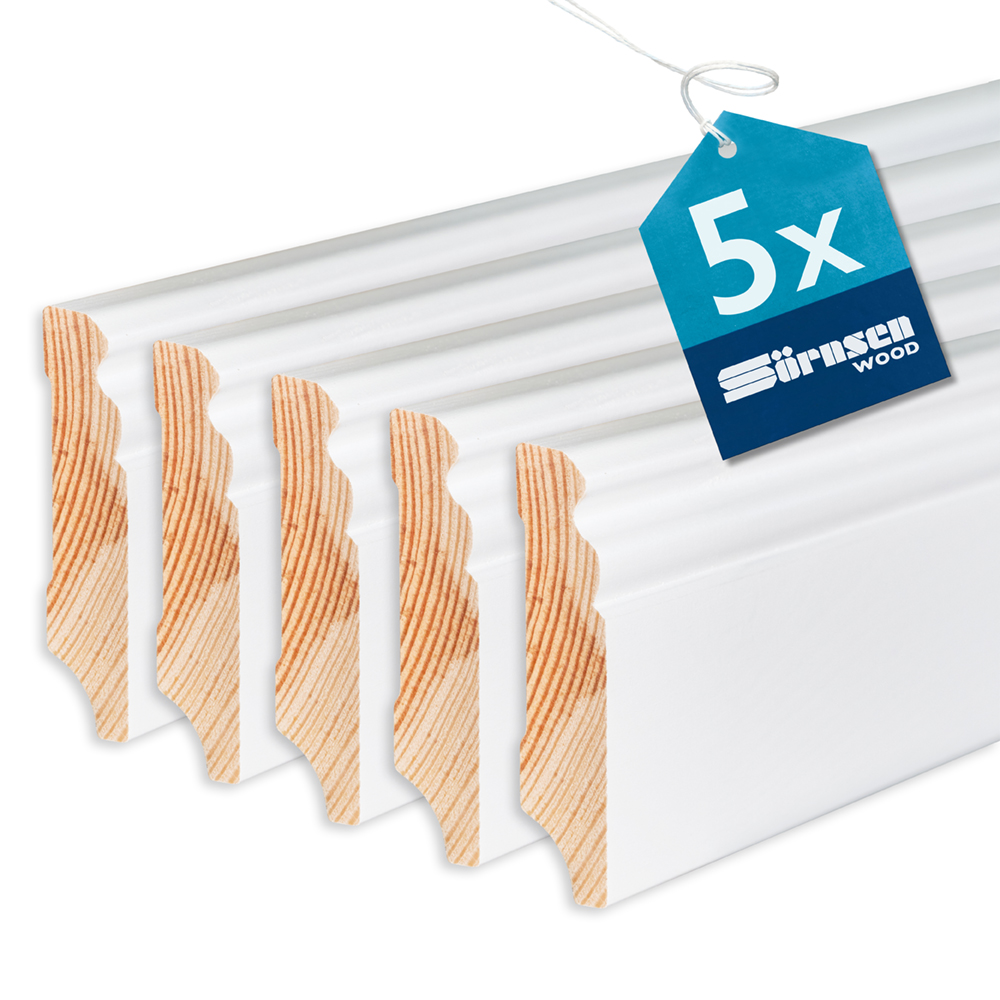 Produktinformationen "5x Sockelleiste Kiefer mit Altdeutschem Profil, weiß, 16 x 70 x 2400 mm, Sörnsen Wood"