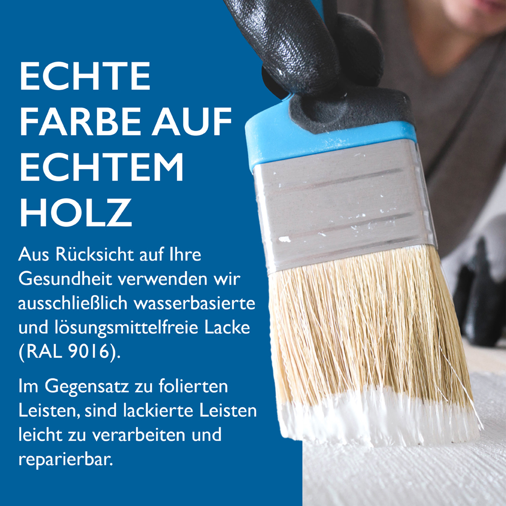 Gefertigt aus nordischer Kiefer, überzeugt diese Massivholzleiste durch ihre Stabilität und Langlebigkeit. Die Leiste ist PEFC oder FSC zertifiziert und somit umweltfreundlich und nachhaltig produziert. Die dreifache, lösemittelfreie Lackierung (Farbton: RAL 9016) der Bodenleisten mit gesundheitsschonendem und umweltfreundlichem Wasserlack sorgt für eine gleichmäßige, glatte Oberfläche, die leicht zu reinigen ist und Ihrem Raum ein modernes, sauberes Finish verleiht. Ein weiterer Vorteil: Im Gegensatz zu folierten Leisten, sind lackierte Leisten leicht zu verarbeiten und reparierbar.