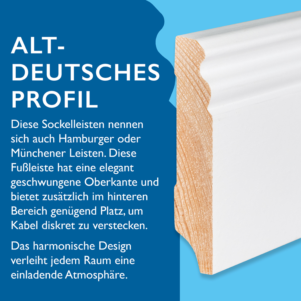 Unsere Sockelleiste Kiefer in den Abmessungen 16 x 80 x 2400 mm vereint Eleganz und Funktionalität. Das altdeutsche Profil bietet eine elegante und traditionelle Optik, die Ihrem Zuhause eine besondere Note verleiht.