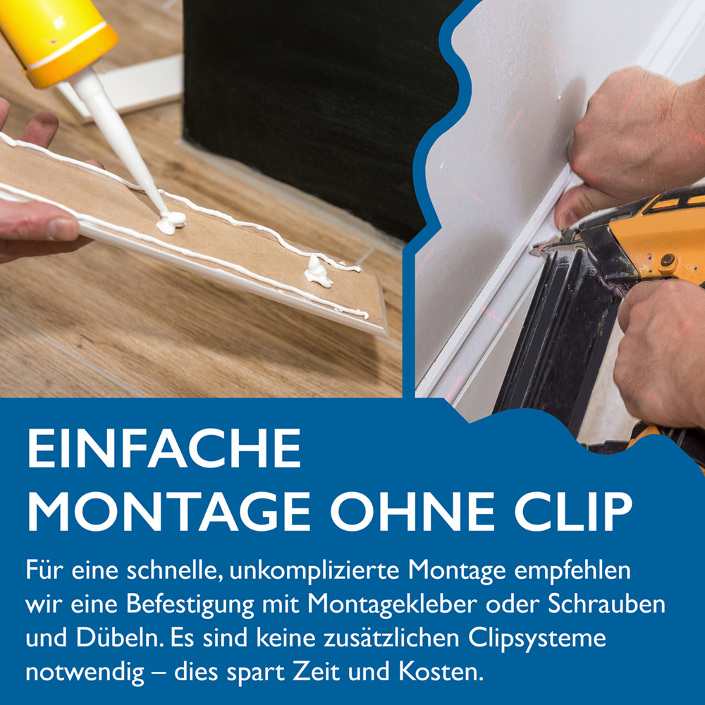 Die Montage ist unkompliziert und schnell: Mit Montagekleber oder Schrauben und Dübeln befestigt, benötigen Sie keine zusätzlichen Clipsysteme. Dies spart Ihnen Zeit und Kosten. Unsere Sockelleisten sind in praktischen Bündeln zu je 5 Stück erhältlich, ideal für größere Projekte.