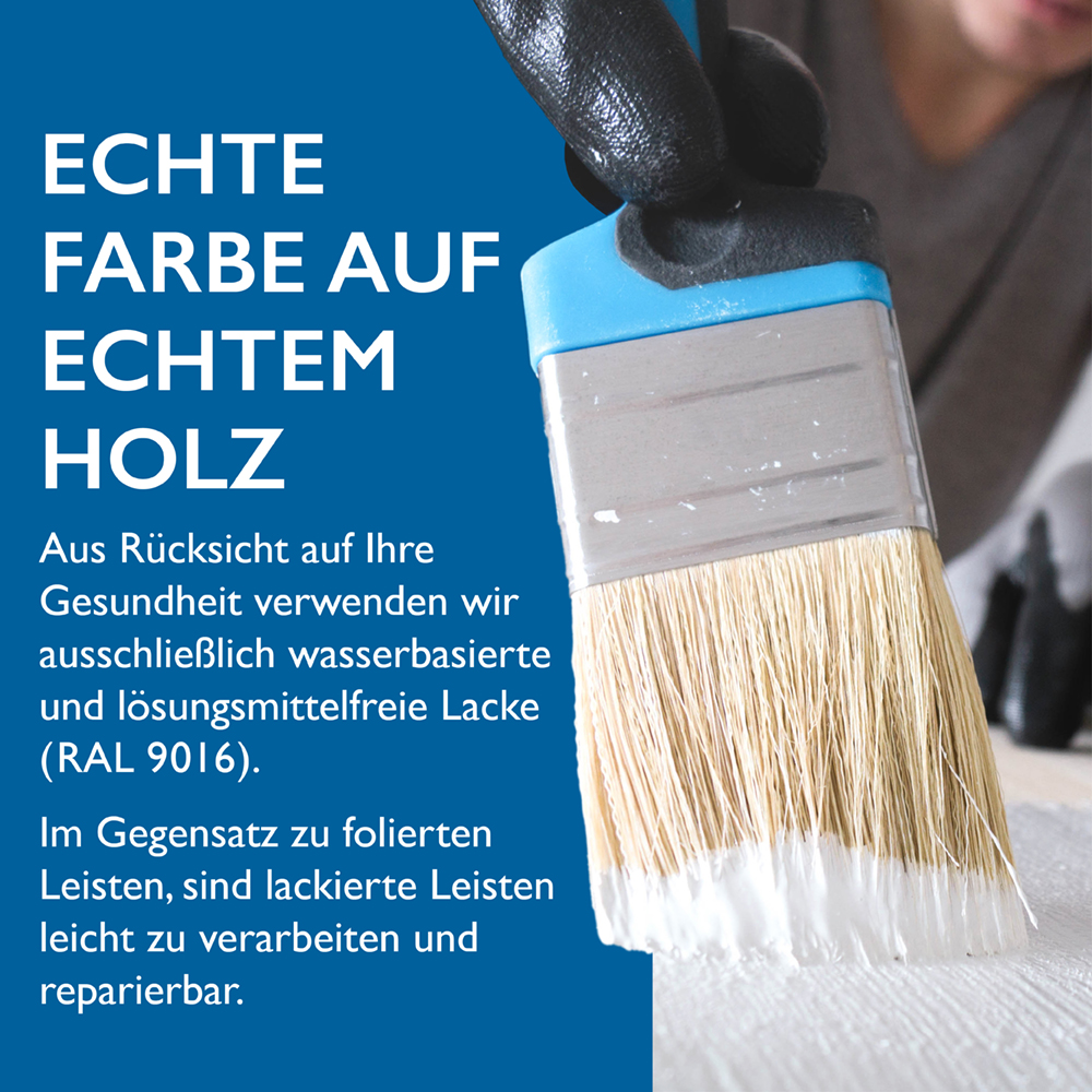 Gefertigt aus nordischer Kiefer, überzeugt diese Massivholzleiste durch ihre Stabilität und Langlebigkeit. Die Leiste ist PEFC oder FSC zertifiziert und somit umweltfreundlich und nachhaltig produziert. Die dreifache, lösemittelfreie Lackierung (Farbton: RAL 9016) der Bodenleisten mit gesundheitsschonendem und umweltfreundlichem Wasserlack sorgt für eine gleichmäßige, glatte Oberfläche, die leicht zu reinigen ist und Ihrem Raum ein modernes, sauberes Finish verleiht. Ein weiterer Vorteil: Im Gegensatz zu folierten Leisten, sind lackierte Leisten leicht zu verarbeiten und reparierbar.