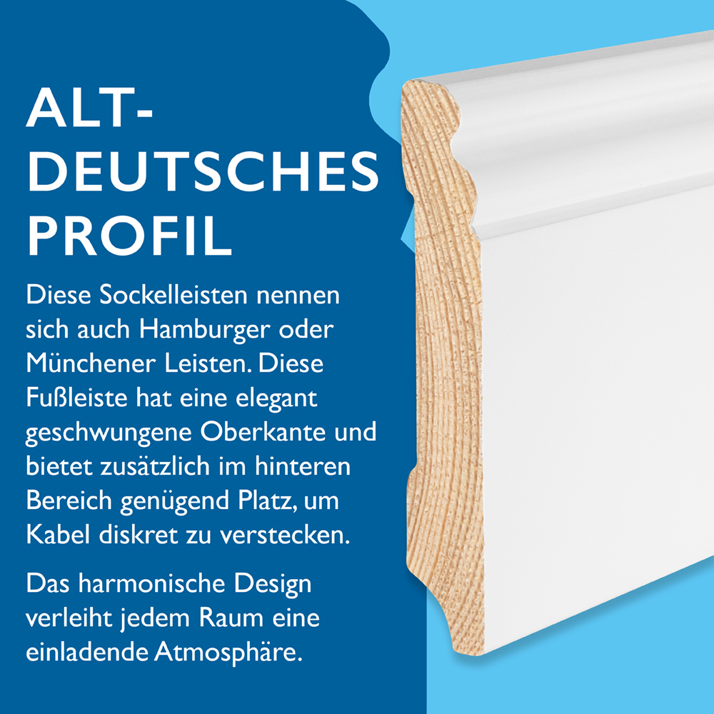 Unsere Sockelleiste Kiefer in den Abmessungen 16 x 95 x 2400 mm vereint Eleganz und Funktionalität. Das altdeutsche Profil bietet eine elegante und traditionelle Optik, die Ihrem Zuhause eine besondere Note verleiht.