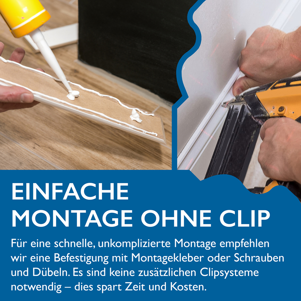 Die Montage ist unkompliziert und schnell: Mit Montagekleber oder Schrauben und Dübeln befestigt, benötigen Sie keine zusätzlichen Clipsysteme. Dies spart Ihnen Zeit und Kosten. Unsere Sockelleisten sind in praktischen Bündeln zu je 5 Stück erhältlich, ideal für größere Projekte.