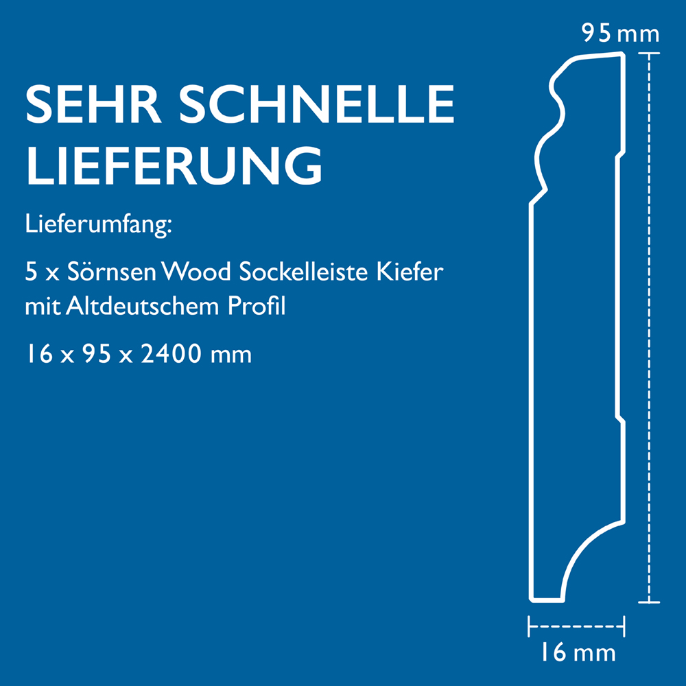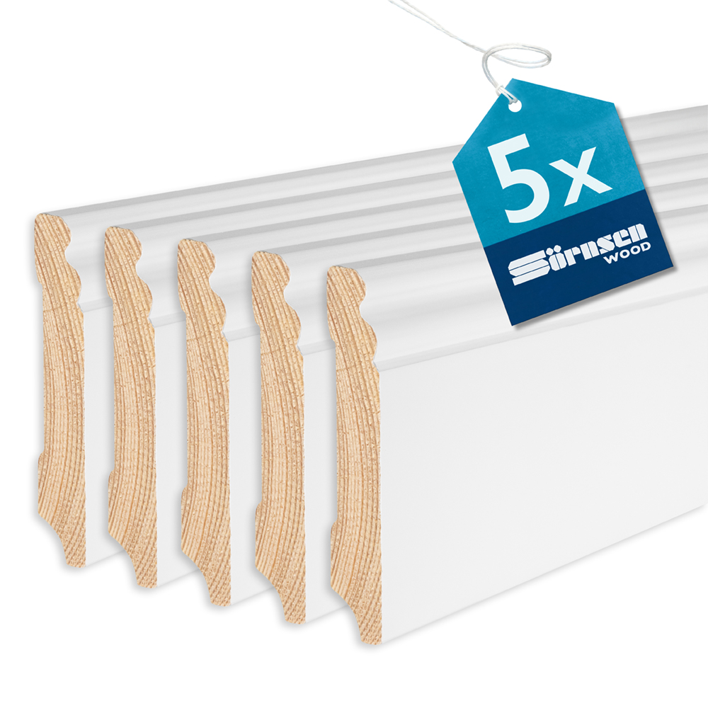Produktinformationen "5x Sockelleiste Kiefer mit Altdeutschem Profil, weiß, 16 x 95 x 2400 mm, Sörnsen Wood"