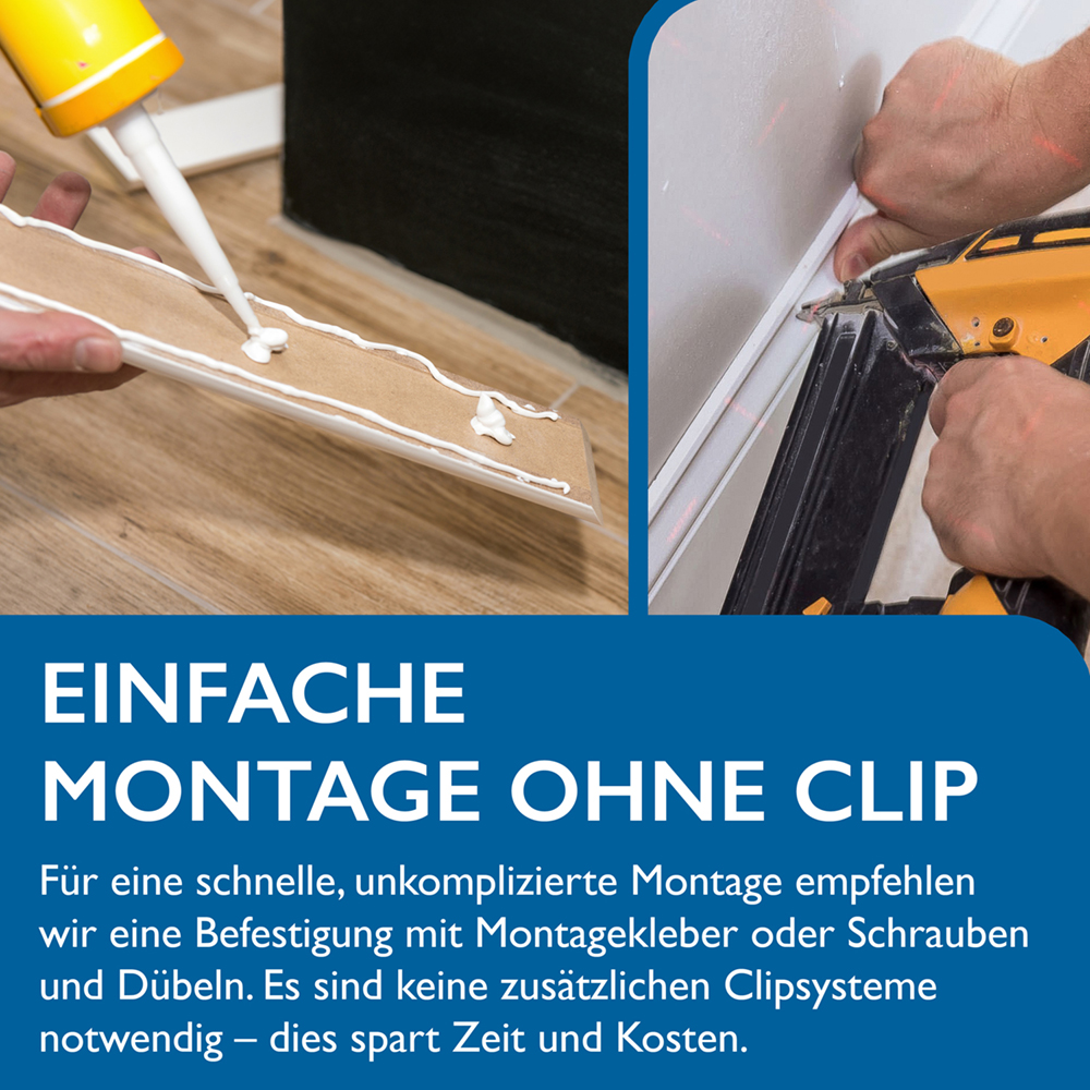 Die Montage ist unkompliziert und schnell: Mit Montagekleber oder Schrauben und Dübeln befestigt, benötigen Sie keine zusätzlichen Clipsysteme. Dies spart Ihnen Zeit und Kosten. Unsere Sockelleisten sind in praktischen Bündeln zu je 5 Stück erhältlich, ideal für größere Projekte.