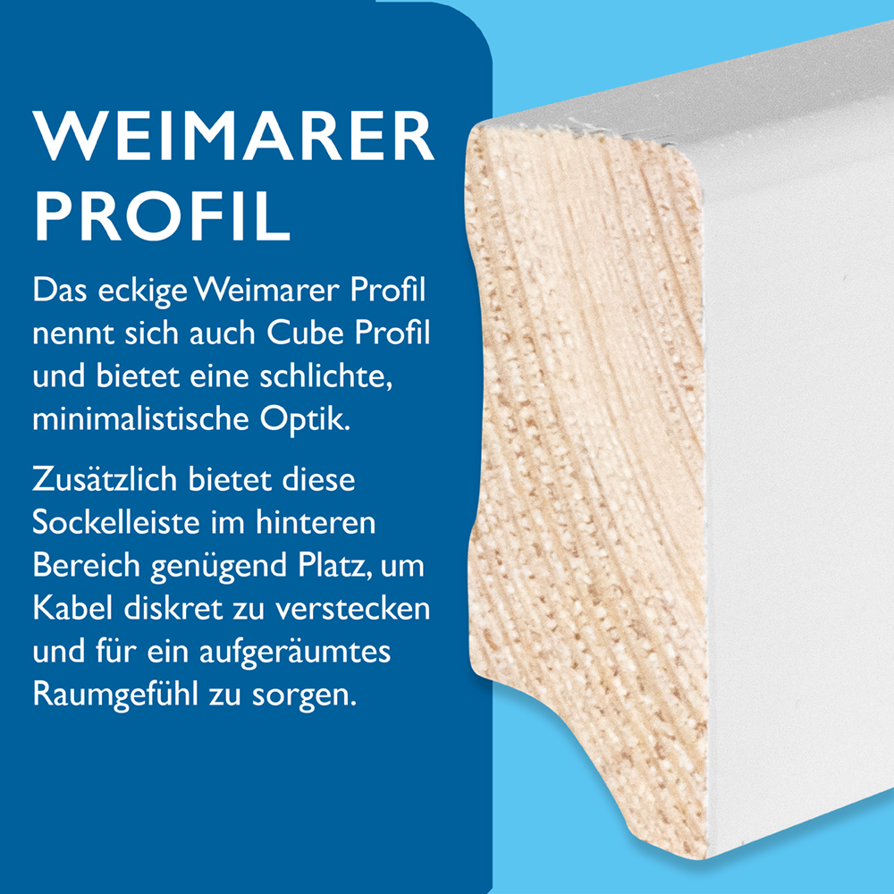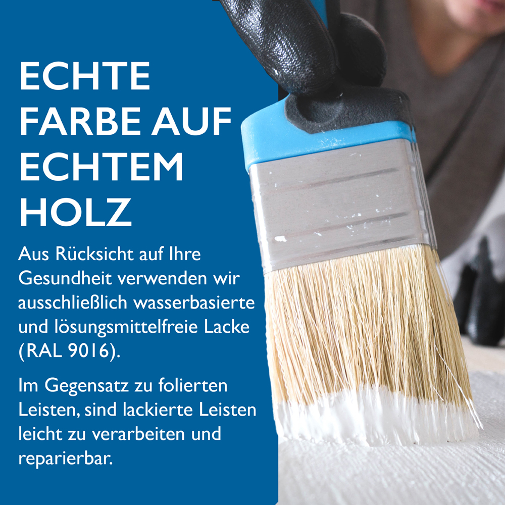 Gefertigt aus nordischer Kiefer, überzeugt diese Massivholzleiste durch ihre Stabilität und Langlebigkeit. Die Leiste ist PEFC oder FSC zertifiziert und somit umweltfreundlich und nachhaltig produziert. Die dreifache, lösemittelfreie Lackierung (Farbton: RAL 9016) der Bodenleisten mit gesundheitsschonendem und umweltfreundlichem Wasserlack sorgt für eine gleichmäßige, glatte Oberfläche, die leicht zu reinigen ist und Ihrem Raum ein modernes, sauberes Finish verleiht. Ein weiterer Vorteil: Im Gegensatz zu folierten Leisten, sind lackierte Leisten leicht zu verarbeiten und reparierbar.