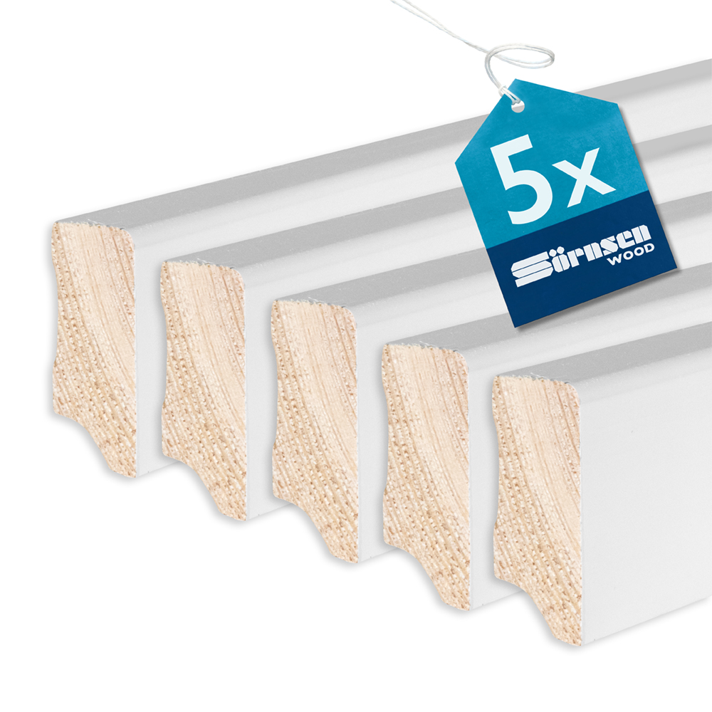 Produktinformationen "5x Sockelleiste Kiefer mit Weimarer Profil, weiß, 16 x 40 x 2400 mm, Sörnsen Wood"