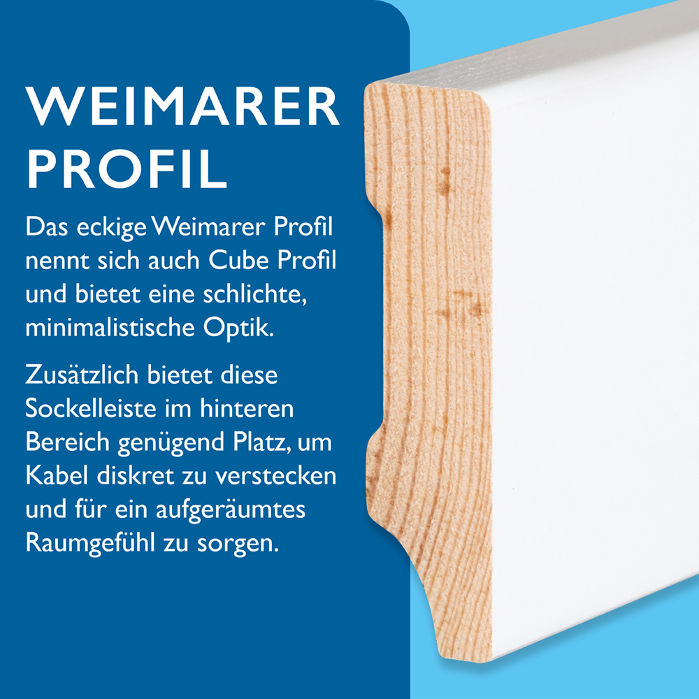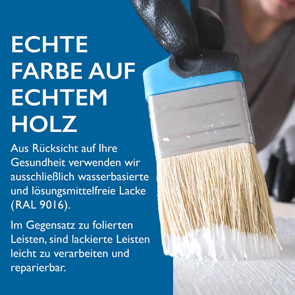 Gefertigt aus nordischer Kiefer, überzeugt diese Massivholzleiste durch ihre Stabilität und Langlebigkeit. Die Leiste ist PEFC oder FSC zertifiziert und somit umweltfreundlich und nachhaltig produziert. Die dreifache, lösemittelfreie Lackierung (Farbton: RAL 9016) der Bodenleisten mit gesundheitsschonendem und umweltfreundlichem Wasserlack sorgt für eine gleichmäßige, glatte Oberfläche, die leicht zu reinigen ist und Ihrem Raum ein modernes, sauberes Finish verleiht. Ein weiterer Vorteil: Im Gegensatz zu folierten Leisten, sind lackierte Leisten leicht zu verarbeiten und reparierbar.