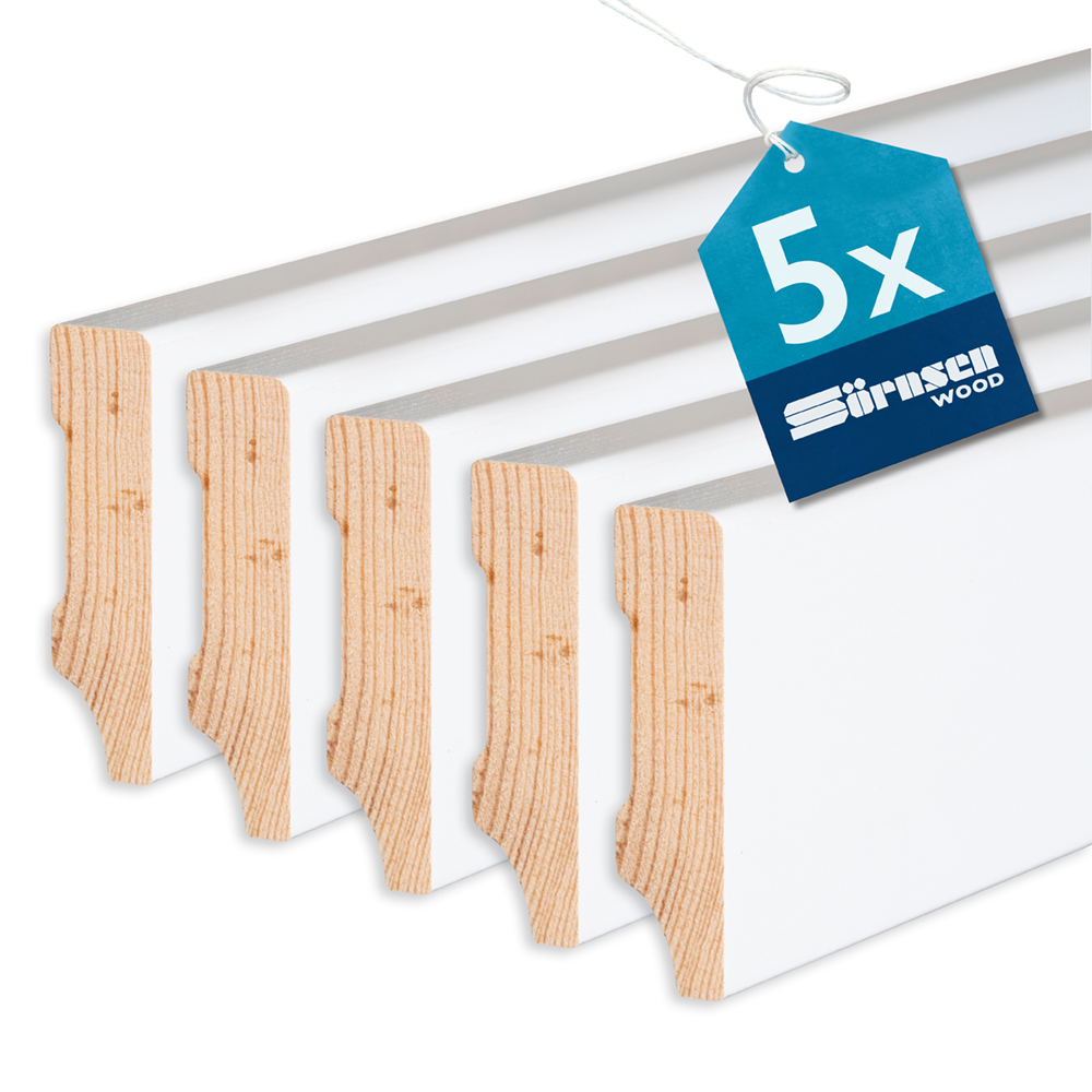 Produktinformationen "5x Sockelleiste Kiefer mit Weimarer Profil, weiß, 16 x 58 x 2400 mm, Sörnsen Wood"