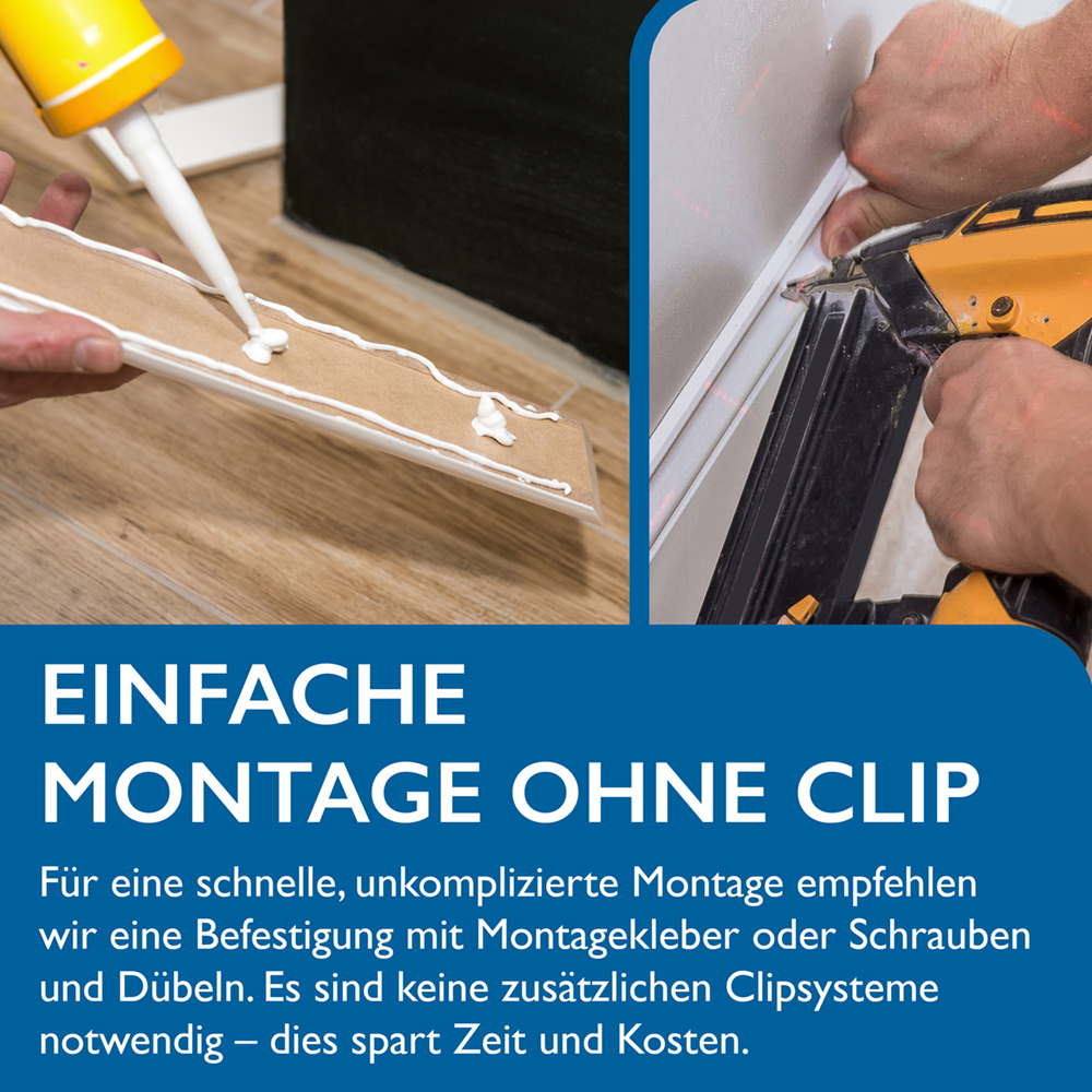 Die Montage ist unkompliziert und schnell: Mit Montagekleber oder Schrauben und Dübeln befestigt, benötigen Sie keine zusätzlichen Clipsysteme. Dies spart Ihnen Zeit und Kosten. Unsere Sockelleisten sind in praktischen Bündeln zu je 5 Stück erhältlich, ideal für größere Projekte.